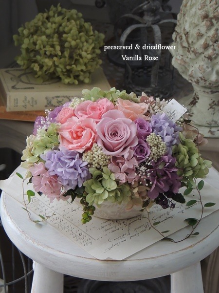 「バラと紫陽花とかすみ草のオーバルアレンジメント・ピンクパープル」