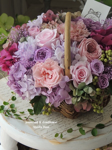 「バラと実物のバスケットアレンジメント・ピンクライラック」