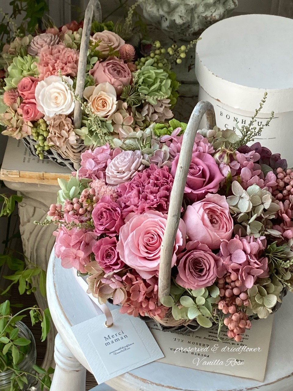 母の日におすすめのバスケットアレンジメント2点アップしました! | プリザーブド&ドライフラワー バニラローズ