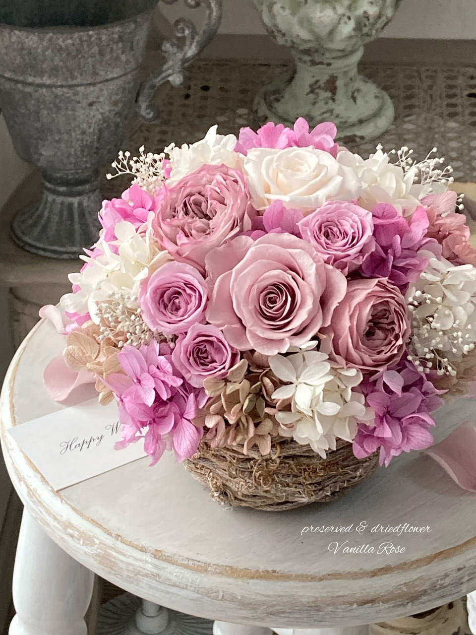 ナチュラルカゴのアレンジメント・アンティークピンクをリニューアルしました! | プリザーブド&ドライフラワー バニラローズ