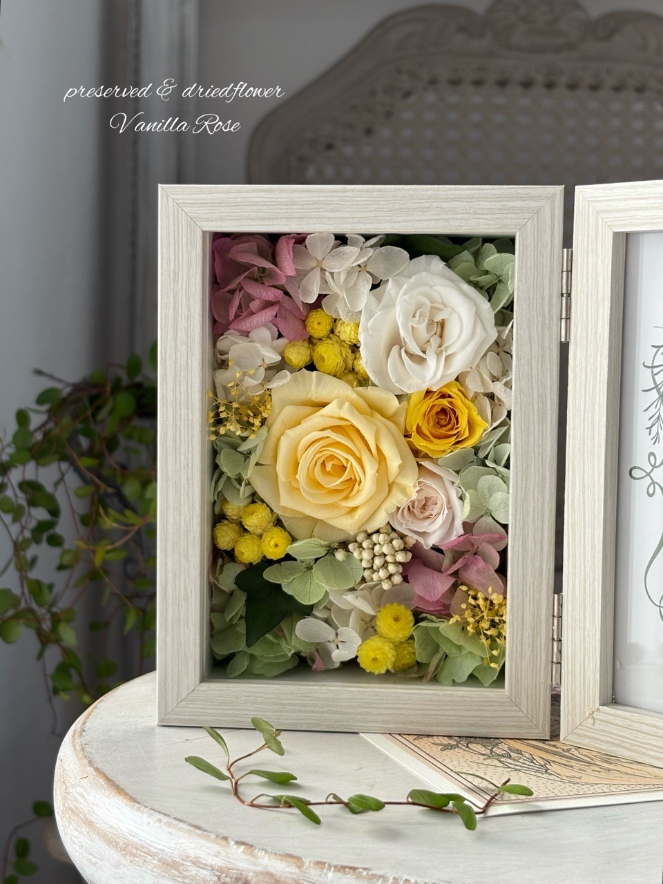 【新作】フォトフレーム付きお供え花/イエローピンクをアップしました! | プリザーブド&ドライフラワー バニラローズ