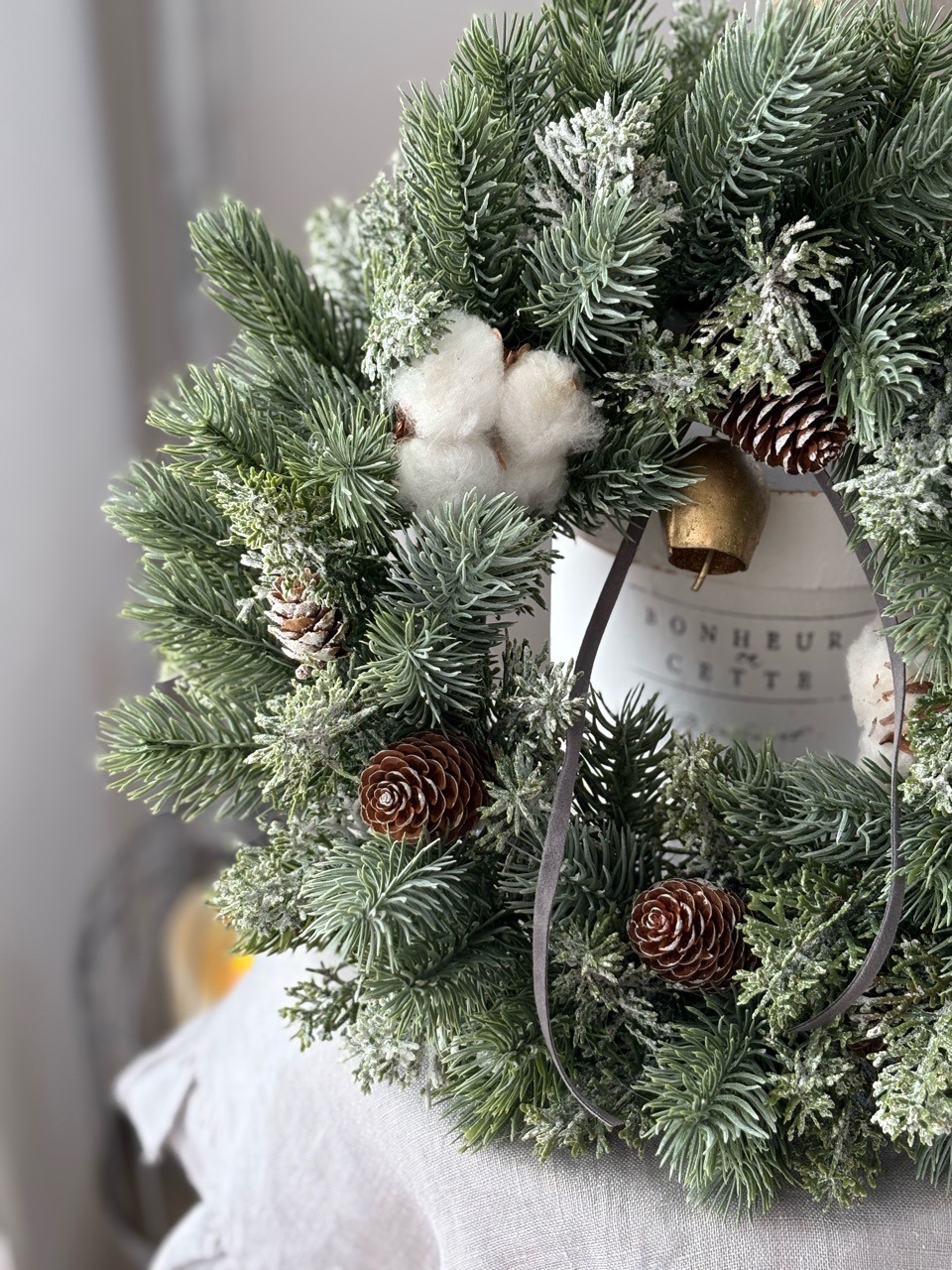 アーティフィシャルのモミやヒバで直径30㎝のリースを作りました。