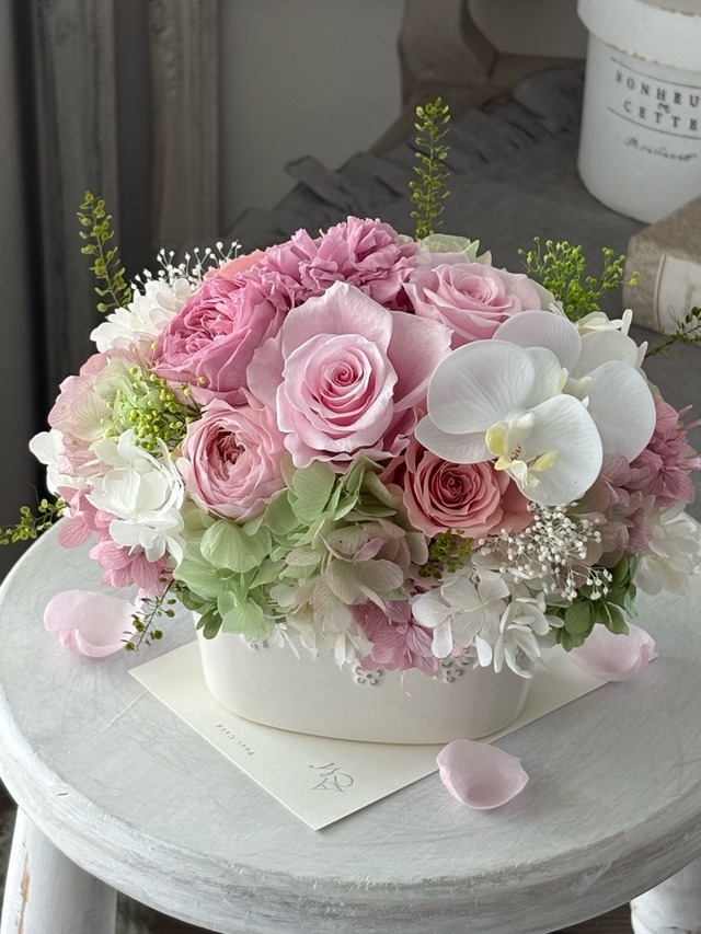 新居祝いや開業祝など、新たな門出を祝う贈り物におすすめのプリザーブドフラワーギフトです。 やわらかなピンクのバラを中心に、純白のミニ胡蝶蘭と淡いグリーンの紫陽花を合わせた、上品で春らしいプリザーブドフラワーアレンジメントです。 胡蝶蘭には「幸せを運んでくる」という花言葉がありお祝いの贈り物として大変人気のお花です。 こちらのアレンジメントはすっきりとしたオーバル型をしていますので、カウンターや棚の上など限られたスペースにも飾りやすく置き場所を選びません。 また、プリザーブドフラワーは水やり不要で美しさが長く続くため、お忙しい方へのギフトに最適です。 ご新居のお祝いやサロン、お教室などのオープン祝い、開業のお祝いなどの贈り物にぜひご利用ください。 当ショップでは、ご注文をいただいてからひとつひとつ丁寧に制作しております。 そのため、花材の配置や表情には多少の個体差がございますが、写真の雰囲気を大切にしながら心を込めてお作りいたします。 【オプションについて】 ハガキサイズのメッセージカードを1枚50円でご用意しています。ご希望の場合はオプションで「あり」を選択して下さい。 【配送について】 お届け日時のご希望がある場合は、ご購入者情報をご入力時に「配送オプション」をご利用下さい。 (お届けご希望日が30日以上先の場合は、備考欄にその旨ご記入ください。) 【配送不可の地域について】 大変恐れ入りますが、沖縄県および離島へのお届けは出来ません。何卒ご理解いただきますようお願い申し上げます。 【商品詳細】 サイズ 約幅20cm×高さ15cm×奥行13cm ●バラ2輪、スプレーバラ2輪、オールドローズ(大)1輪、オールドローズ(小)1輪、カーネーション1輪、紫陽花4種類、かすみ草、ペティコートなど。(プリザーブドフラワー)ミニ胡蝶蘭2輪(アーティフィシャルフラワー) ※仕入れの都合により、材料の一部が変更になる場合もございます。あらかじめご了承下さい。 ●フラワーベース=陶器(ホワイト) 【梱包について】 ご注文いただきましたアレンジメントは、お花の色合いに合わせたラッピング材でお包みして段ボール箱にお入れして発送いたします。 (プリザーブドフラワーに関するお取り扱い説明書付) ※画像はイメージです。 【納品書について】 通常、ご本人様にお届けの場合は納品書をお付けしておりますが、それ以外の場合はお付けしておりません。 【返品・交換について】 お客様のご都合による返品・交換は商品の性質上お受けできません。 また、花びらの切れや多少の葉落ちも返品の対象外とさせていただきます。 また、お使いのパソコンやブラウザによって色の見え方に違いがある場合もございますが、色味違いやイメージ違いなどの返品もお受けできませんのでご了承ください。 万一輸送中の事故と考えられる商品が届いた場合は、当ショップの在庫状況を確認の上至急ご対応させていただきます。 商品到着後3日以内に商品の写真を添付の上、メールにてご連絡ください。 それを過ぎますと返品・交換のご要望はお受けできなくなりますのでご了承ください。 【プリザーブドフラワーのお取り扱いについて】 プリザーブドフラワーは湿度と直射日光が苦手です。 日光の当たる窓辺は避け、梅雨時や夏場はクーラーの当たる場所に移動させるなどの工夫をしていただけるといつまでも美しい状態でご鑑賞いただけます。