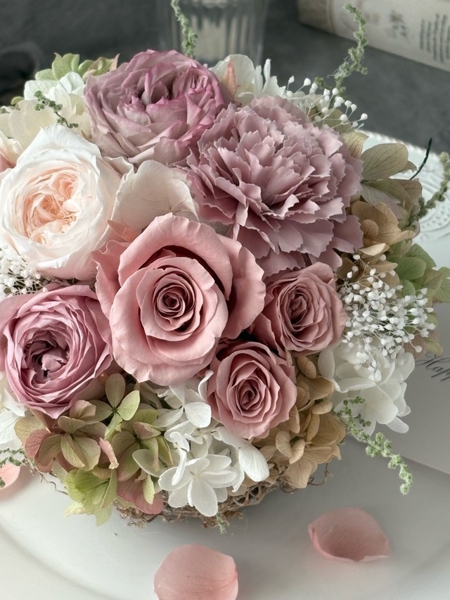 ●バラ1輪、オールドローズ1輪、オールドローズ(小)2輪、ミニバラ3輪、紫陽花4種類、かすみ草、ストーベほか(プリザーブドフラワー)カーネーション1輪(アーティフィシャルフラワー)