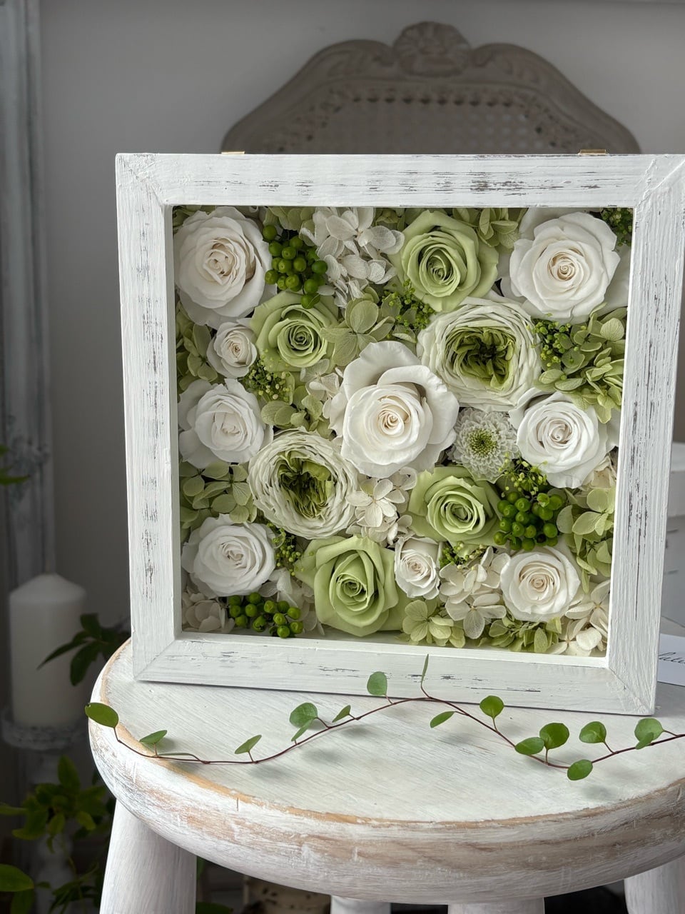 フレームのアレンジメントはプリザーブドフラワーならではのアレンジメント。