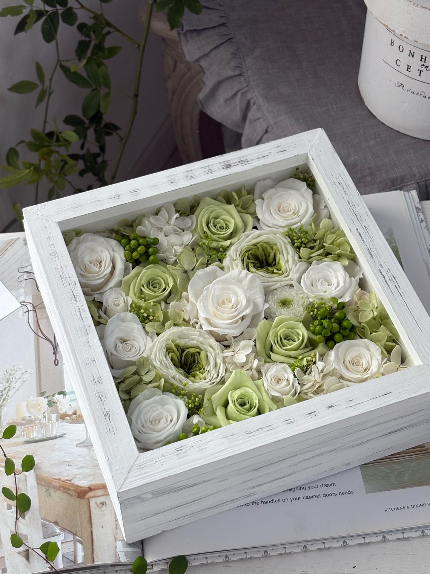 シャビー感のある白いボックス型のフレームに、ミントグリーンのバラとピュアホワイトのバラ、グリーンの実ものやかすみ草を添えて、爽やかでみずみずしい印象のアレンジメントを作りました。