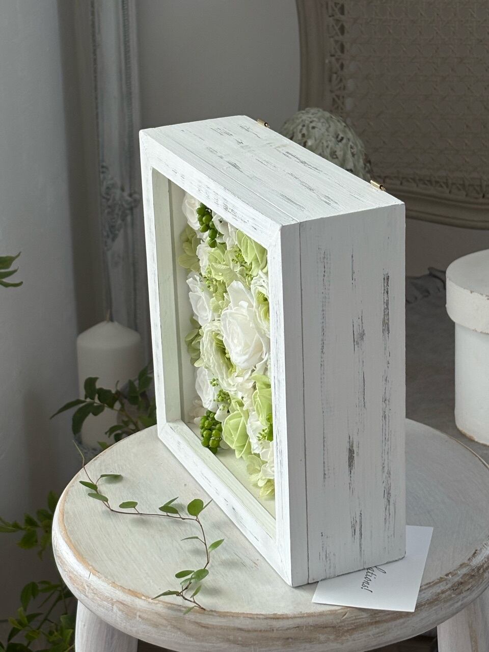 ボックスフレームのアレンジメント/プリザーブドフラワー/ホワイトグリーン/壁掛け可/開業祝い/開店祝い/新築祝い/退職祝い/退任祝い/就任祝い/周年祝い/楽屋花/ギフト包装無料【お届け日時指定可能】【沖縄県・離島へのお届け不可】