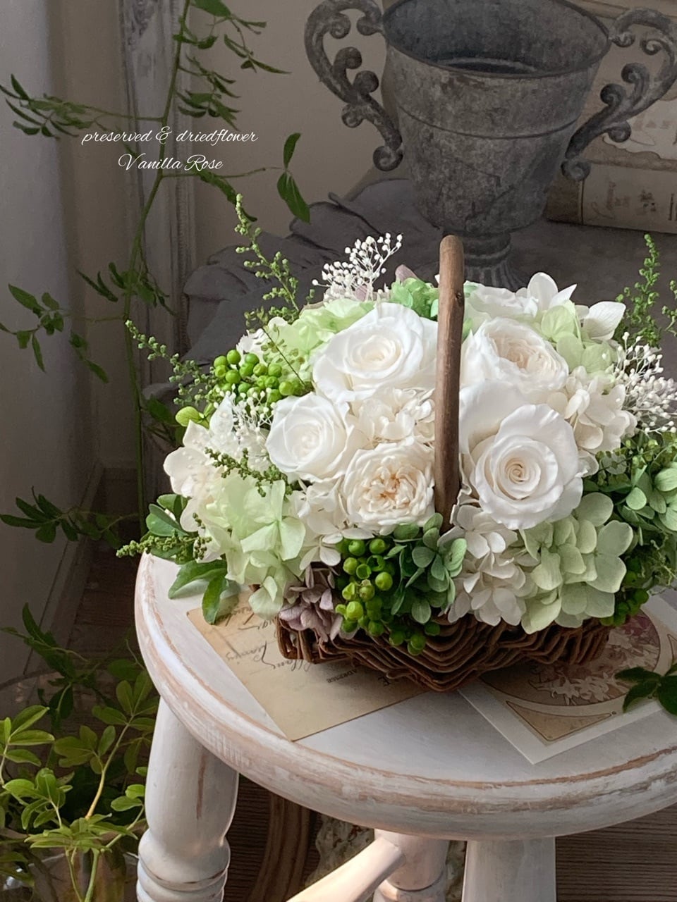 ホワイトグリーンのバスケットアレンジメント/プリザーブドフラワー/新築祝い/新居祝い/開業祝い/開店祝い/周年祝い/就任祝い/お誕生日のお花/記念日のお花/お供え花/ギフト包装無料【お届け日時指定可能】【沖縄県・離島へのお届け不可】