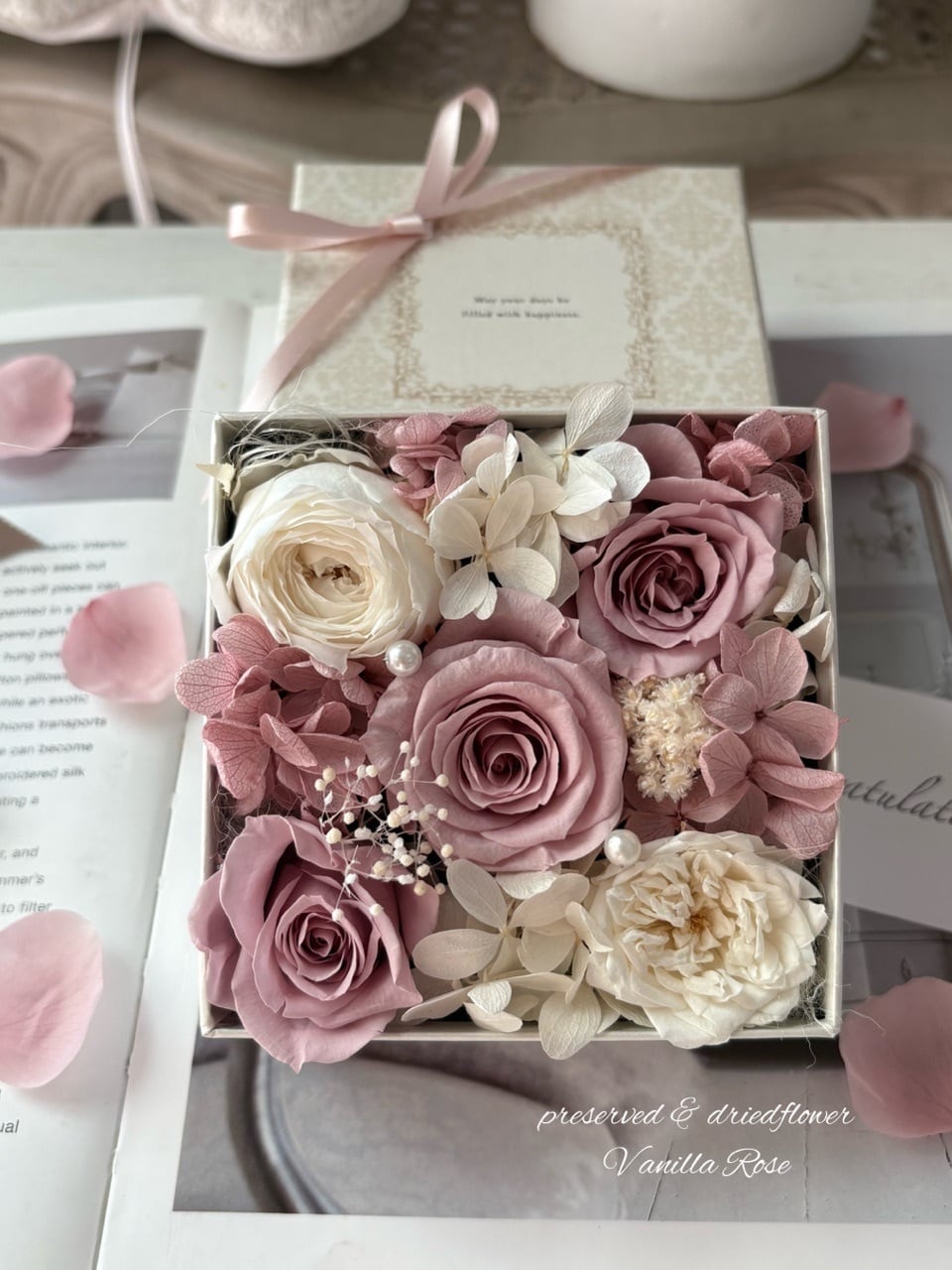 角型の小さなギフトBOXに、くすみピンクとホワイトのバラを詰めてローズギフトを作りました。