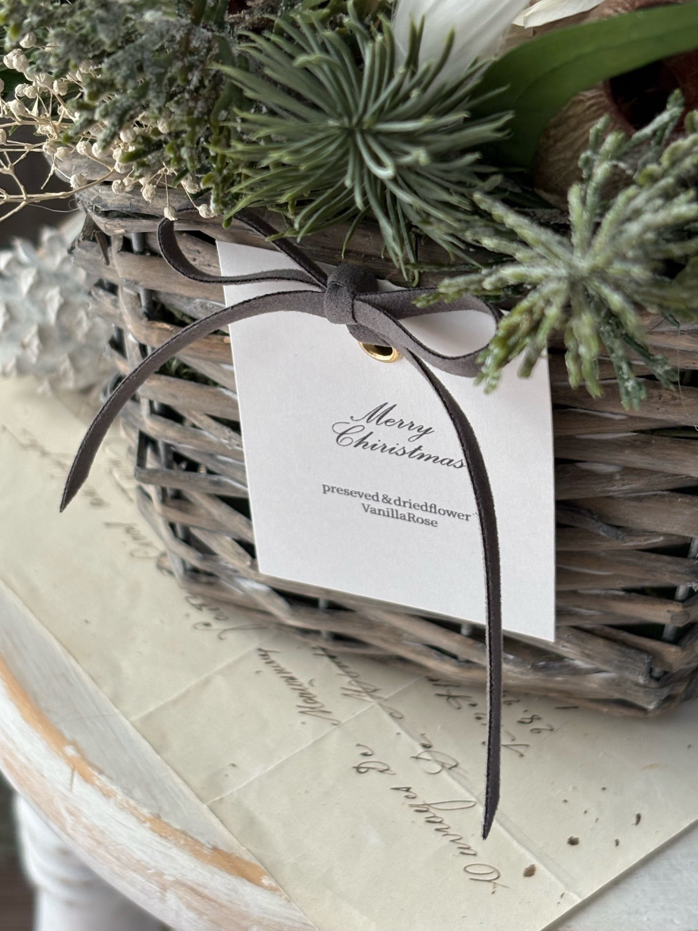 ●スプレーバラ4輪、紫陽花、かすみ草、ユーカリの葉(プリザーブドフラワー)モミ、ヒバ(アーティフィシャル)ドイツトウヒ、ナンキンハゼ、ベルガム、ムイリ―コーンほか(ドライフラワー)、トナカイピック、オーガンジーリボン、ホワイトコキールなど。