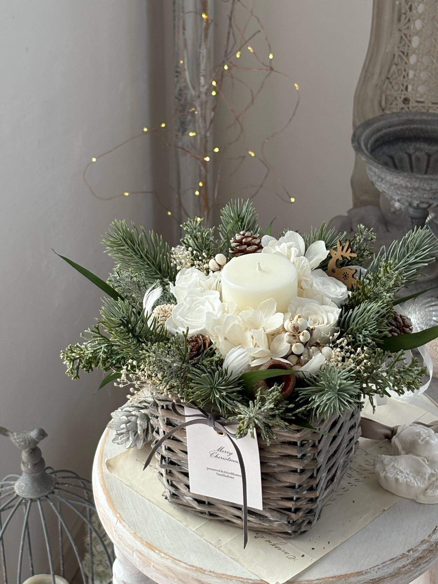 ホワイトのキャンドルを中央に、プリザーブドのバラと紫陽花、アーティフィシャルのモミやヒバでシックなクリスマスのキャンドルアレンジメントを作りました。