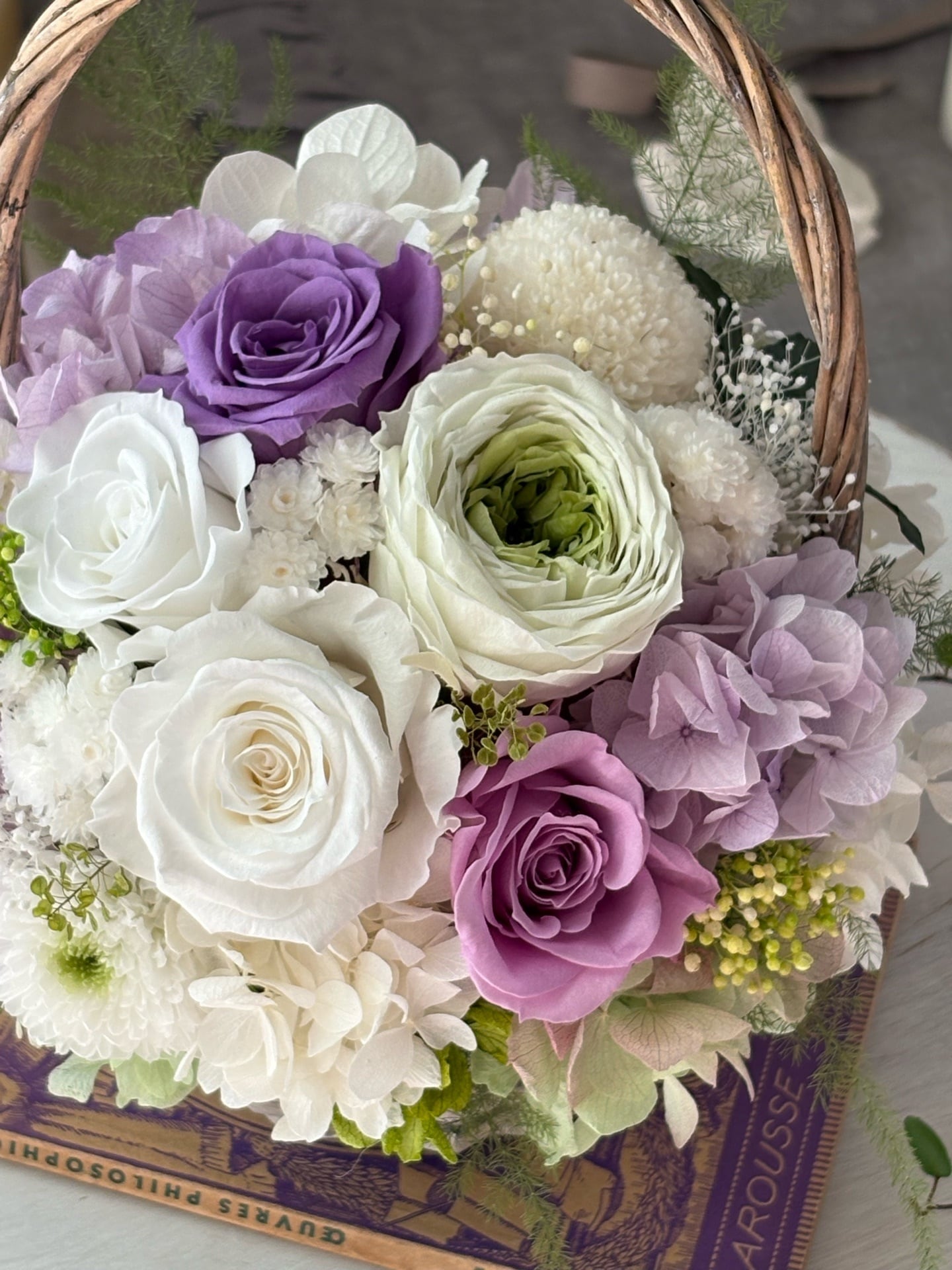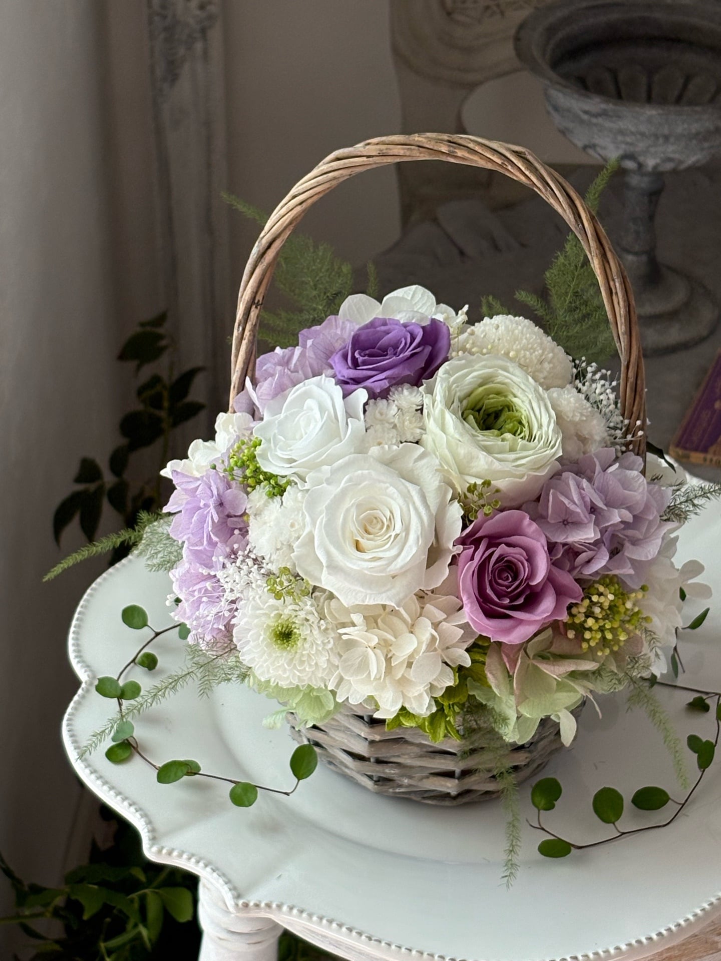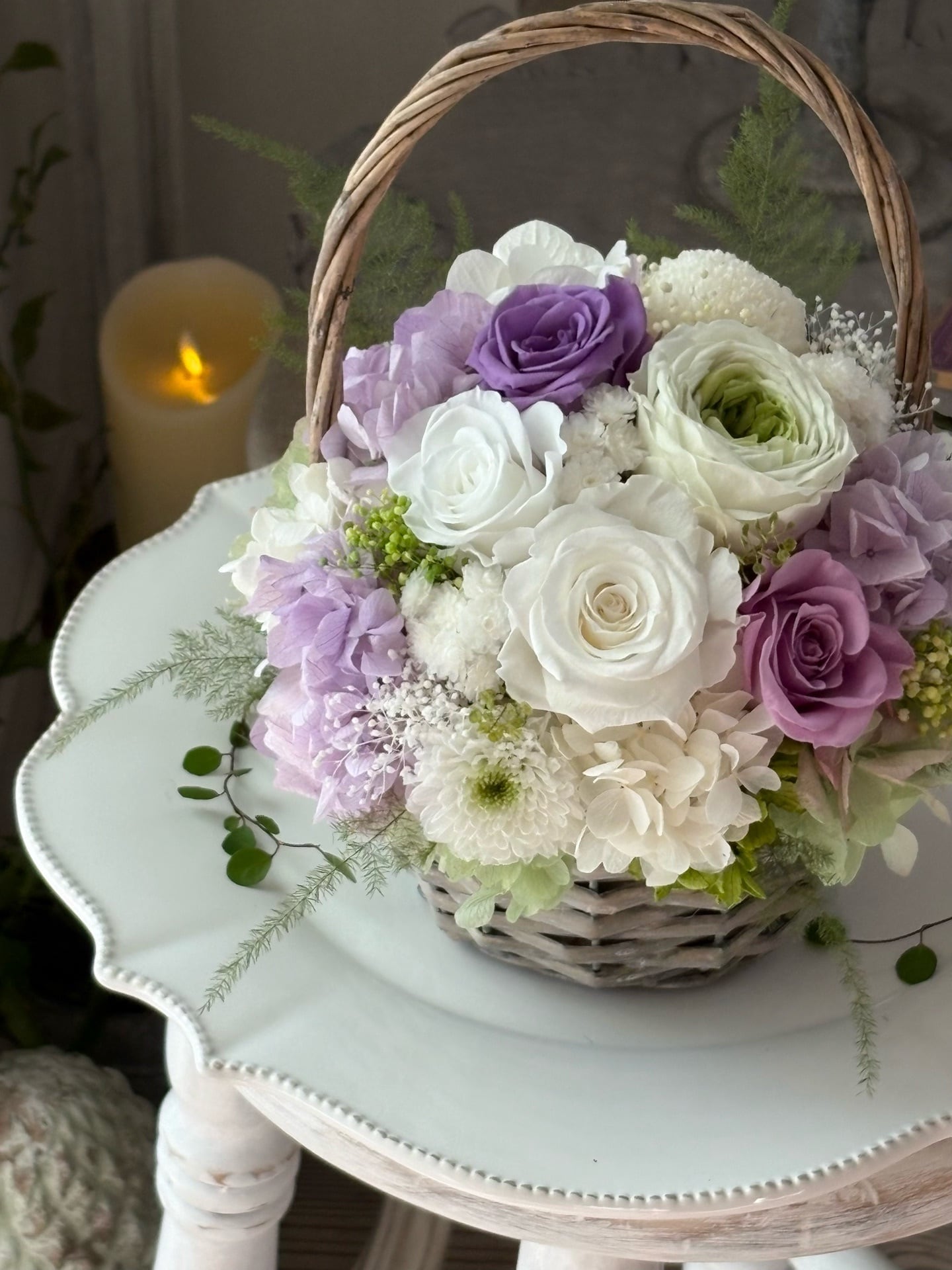 花かごのお供えアレンジメント/プリザーブドフラワー/ホワイトパープル/お供え花/お悔やみのお花/お供えアレンジメント/一周忌のお供え花/三回忌のお供え花/四十九日のお供え花/ラッピング無料【お届け日指定可能】【沖縄県・離島へのお届け不可】