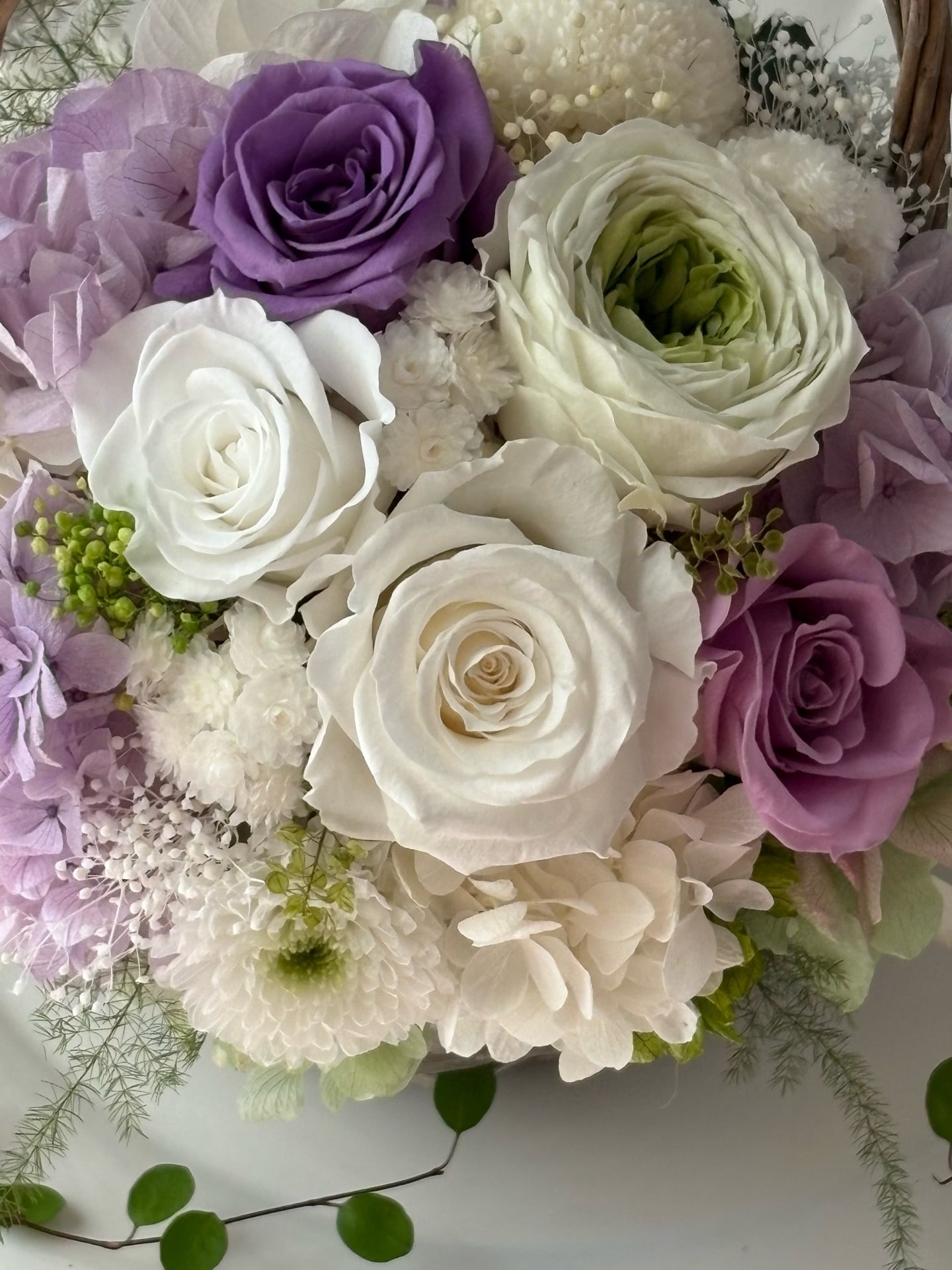 ●バラ1輪、オールドローズ(大)1輪、スプレーバラ3輪、ピンポンマム1輪、小菊1輪、紫陽花4種類、かすみ草、アスパラガスの葉、ペティコート、アイビーリーフほか(すべてプリザーブドフラワー)
