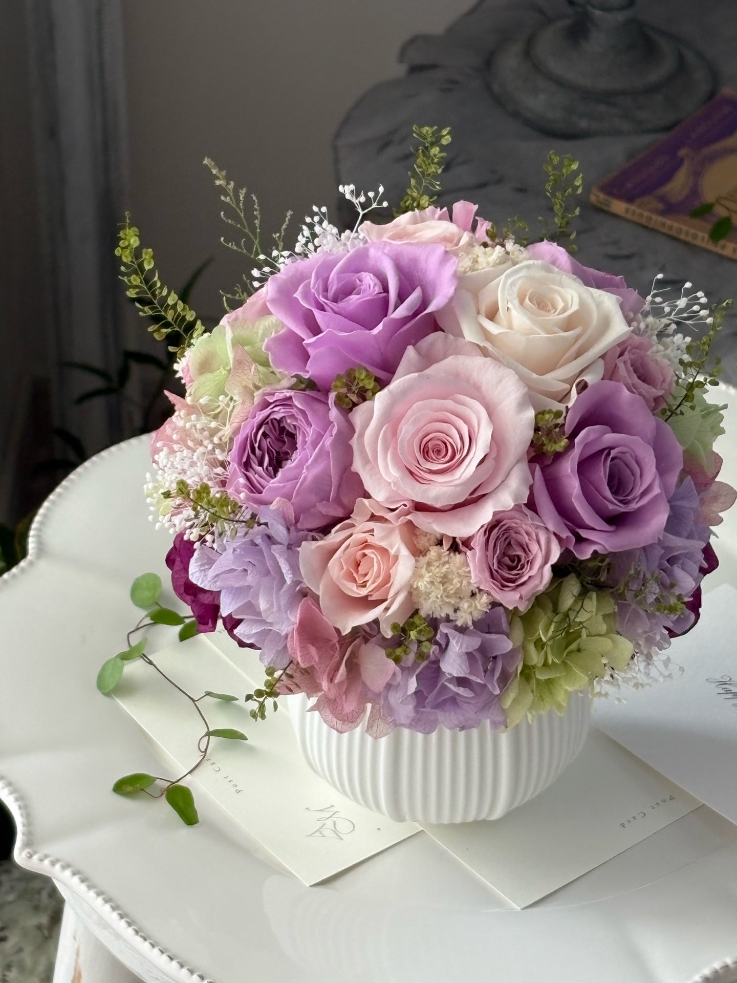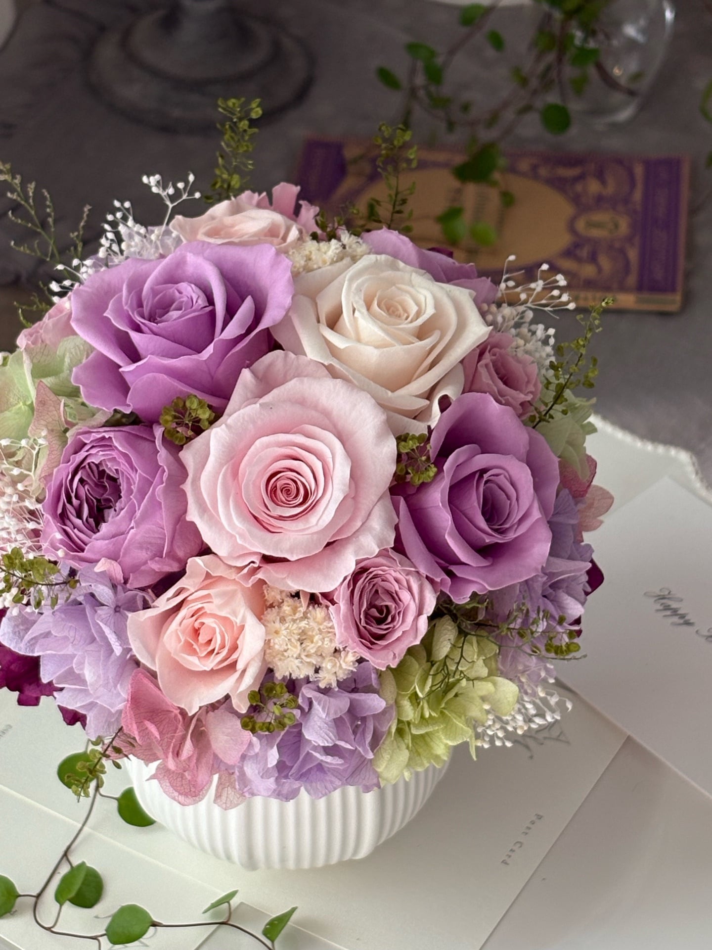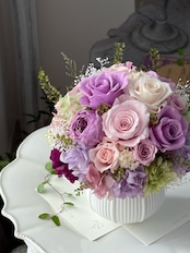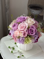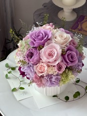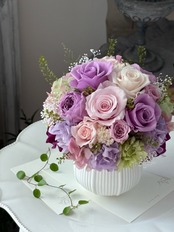 【1点限り】バラのラウンドアレンジメント/プリザーブドフラワー/ライラックピンク/古希祝い/喜寿祝い/傘寿祝い/卒寿祝い/お誕生日のお花/バースデーギフト/記念日のお花/ギフト包装あり【お届け日指定可能】【北海道と沖縄県および離島へのお届け不可】