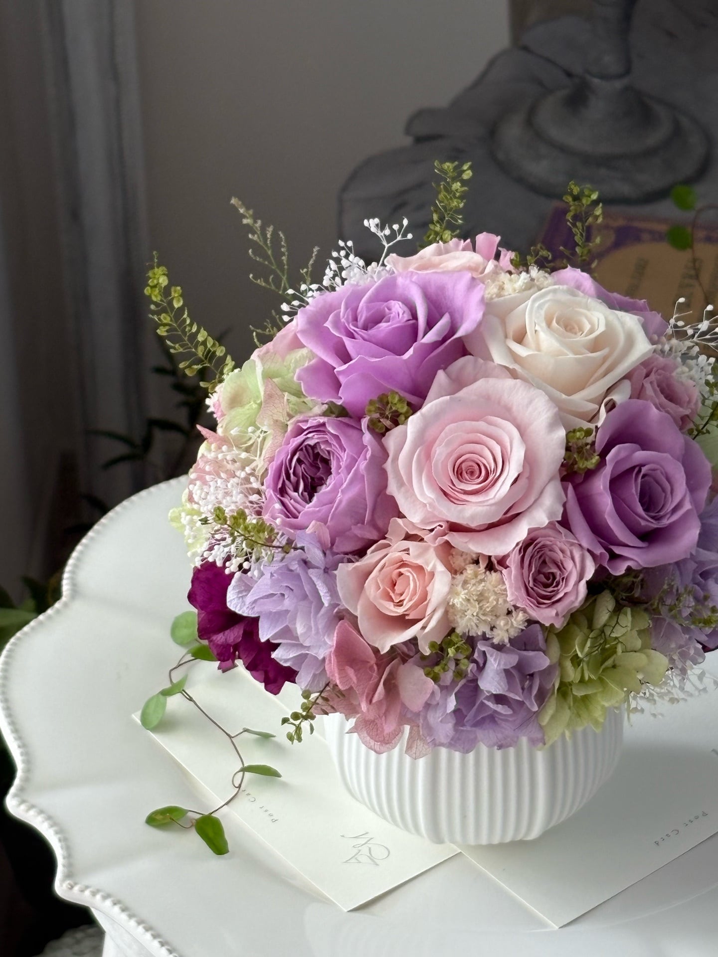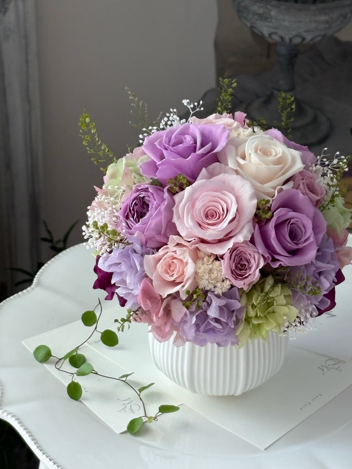 丸みを帯びた白いフラワーベースとの相性も抜群で、エレガントな印象のアレンジメントです。