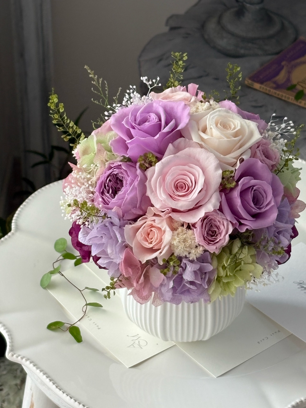 ●バラ1輪、スプレーバラ3輪、オールドローズ(小)2輪、ミニバラ4輪、ミニカーネーション1輪、紫陽花5種類、かすみ草、ペティコートなど。(すべてプリザーブドフラワー)
