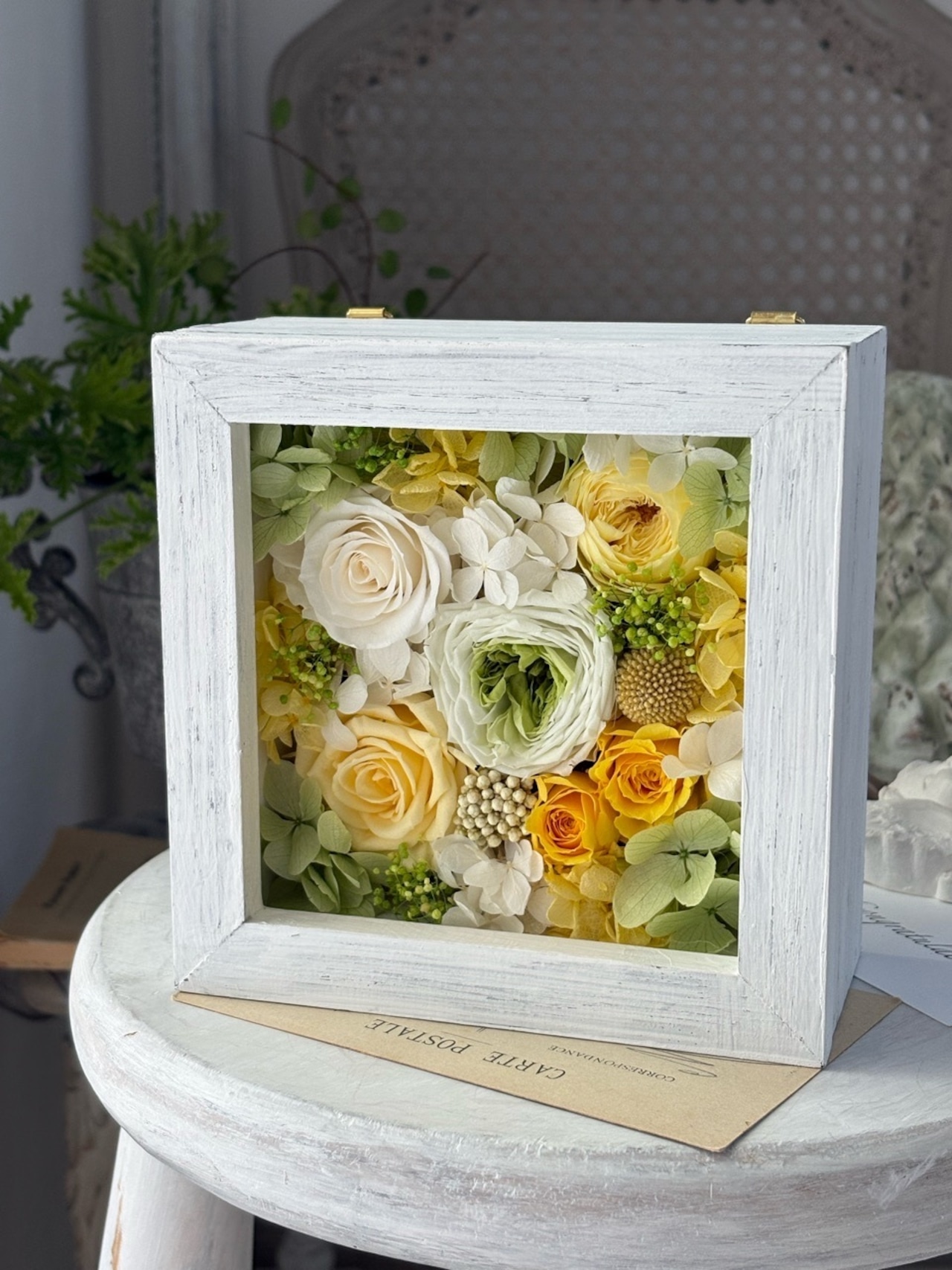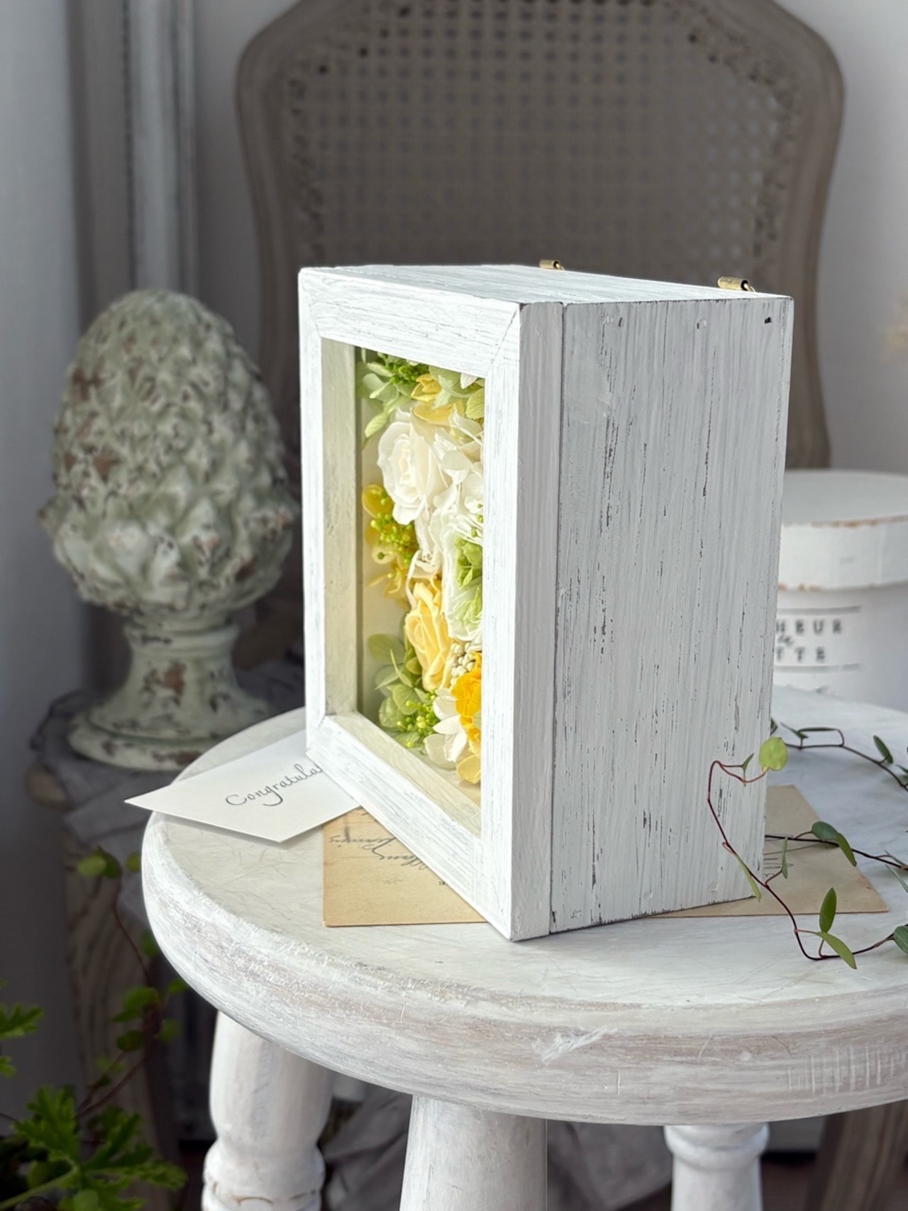 シャビーシックな風合いの白いボックスフレームに、ミントグリーンやイエローのバラをアレンジして春の訪れを感じるアレンジメントを作りました。