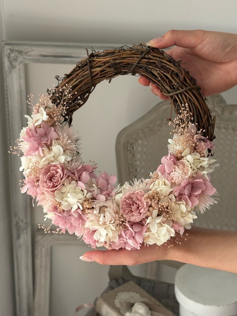 ナチュラルなつるベースに、ベージュピンクのバラやパステルピンクのデージー、2色の紫陽花、かすみ草などをアレンジして甘い雰囲気のハーフリースを作りました。