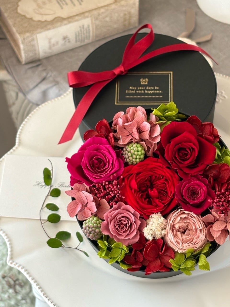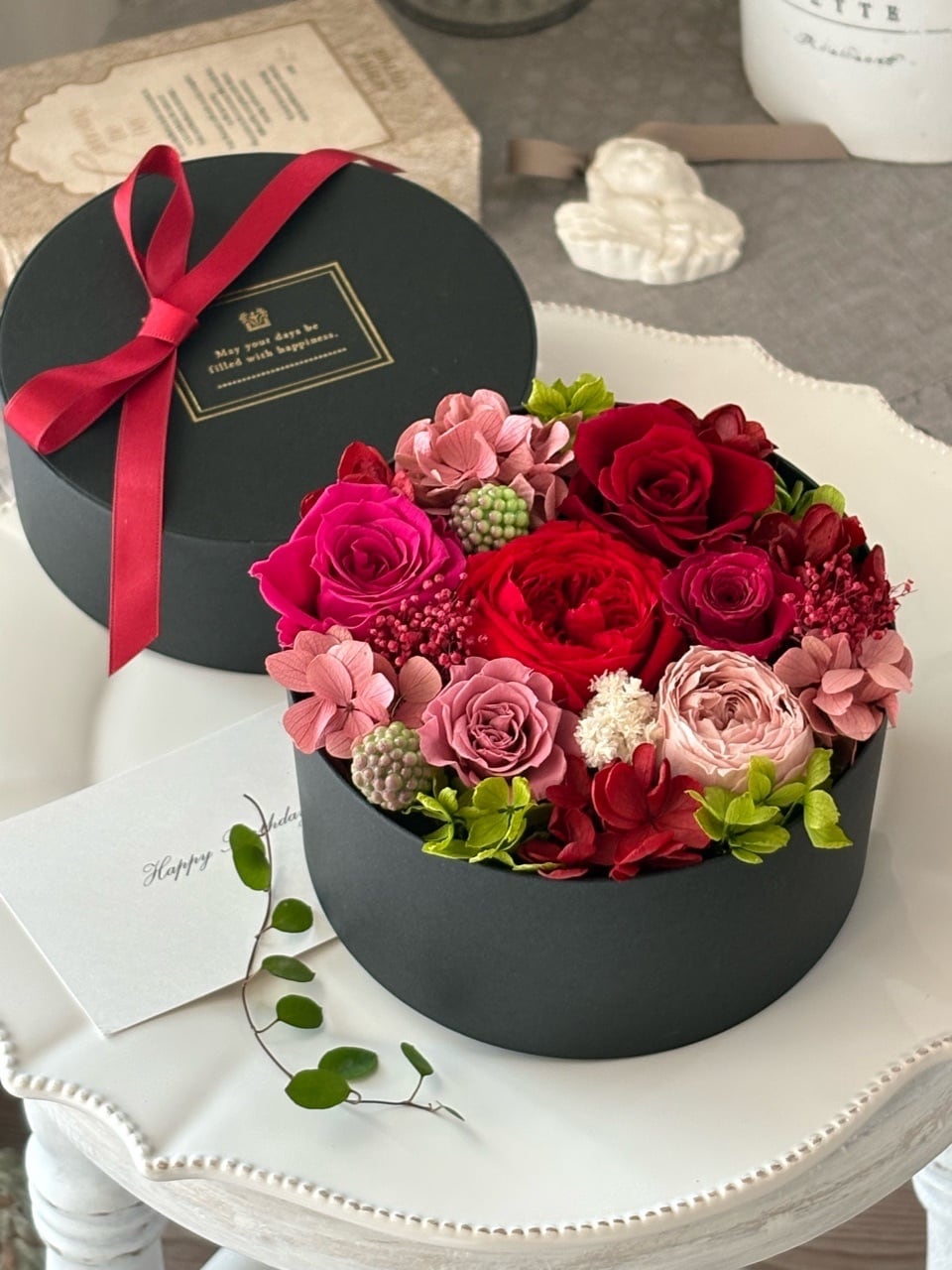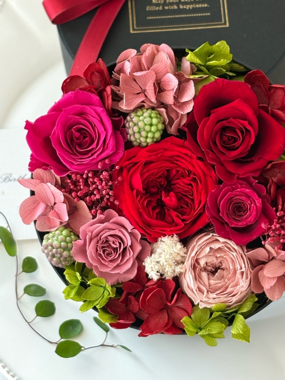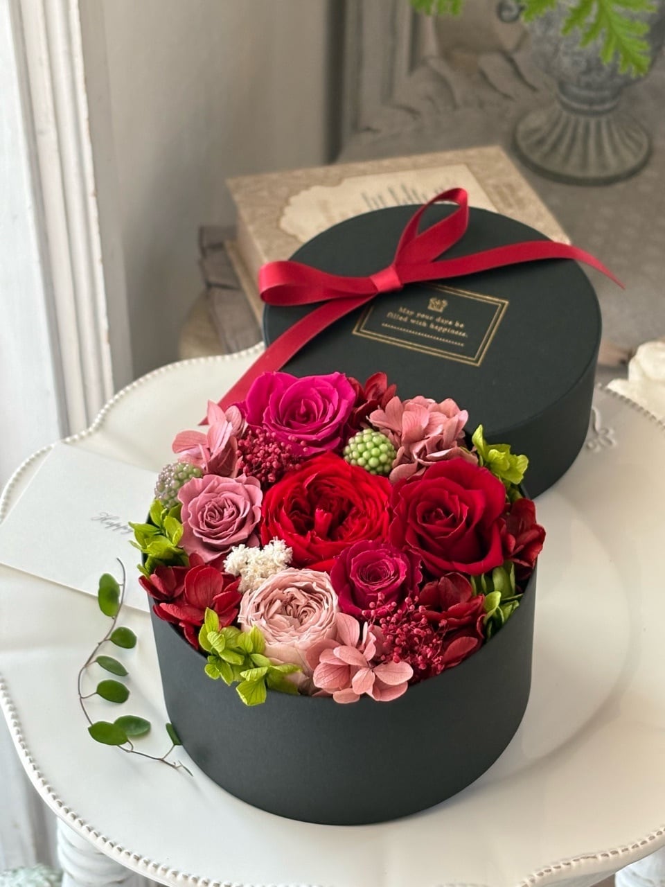 黒い丸型のBOXに、赤、ローズピンク、モーブピンクのバラを詰め合わせてグラマラスなBOXフラワーギフトを作りました。