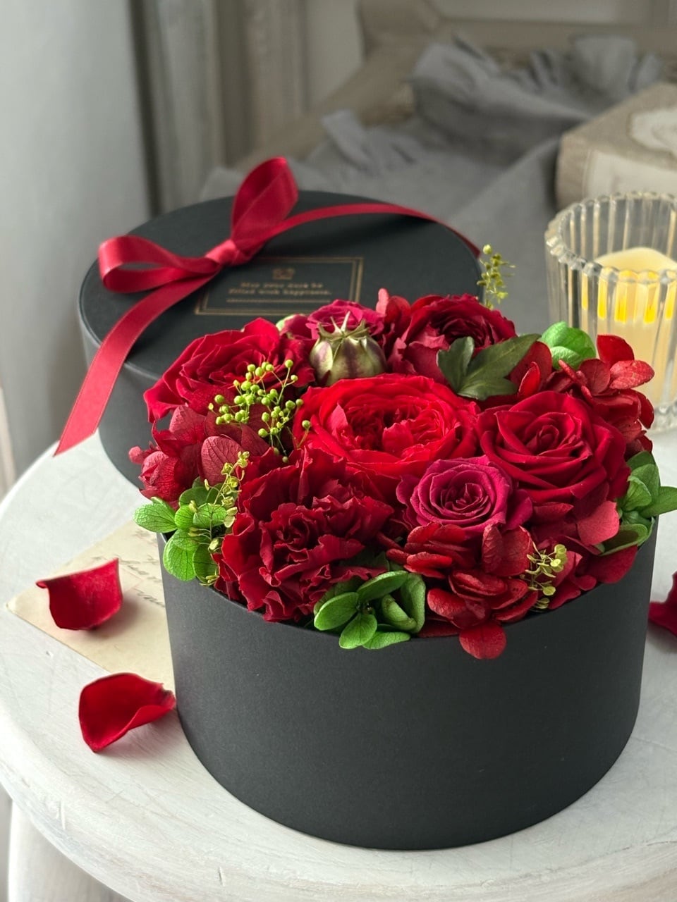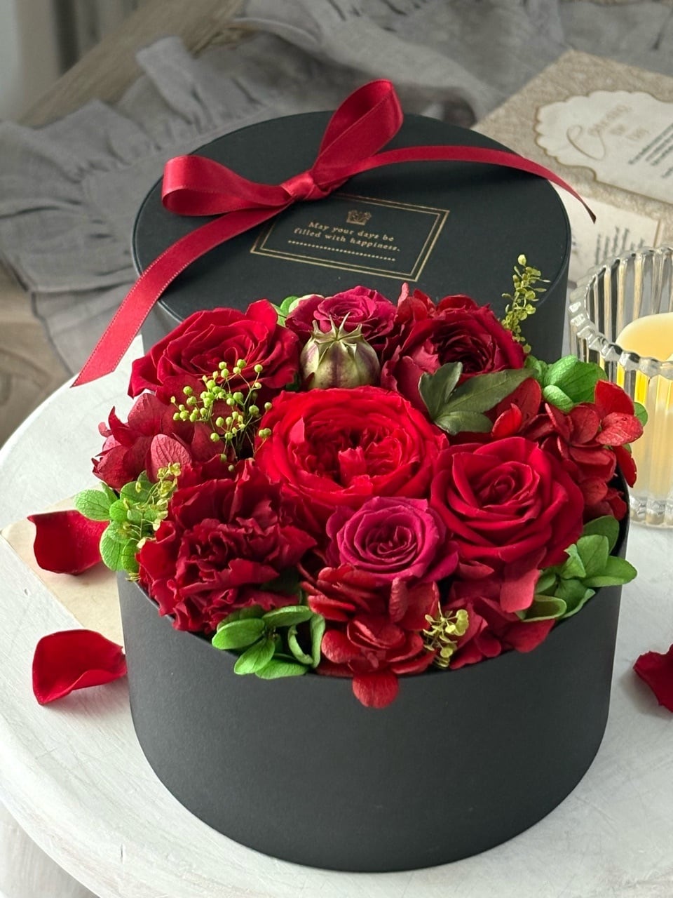 また、BOXのアレンジメントはお花崩れの心配が全くなく、持ち運びがしやすいのが最大のメリット。ホコリや色褪せが気になる場合は、フタをして保管いただけます。