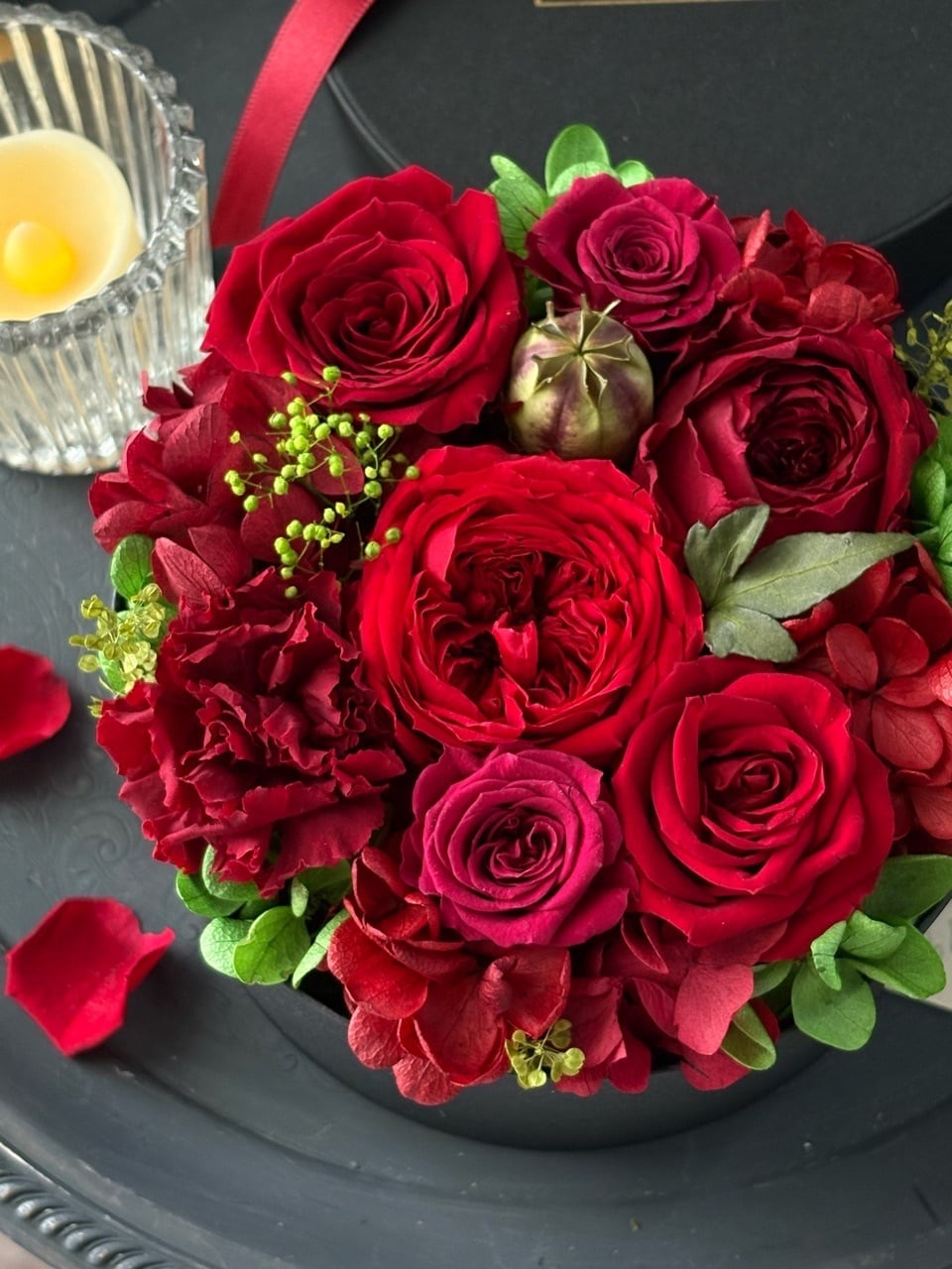 深みのある赤いバラを贅沢にグリーンも添えた、大人の印象のBOXフラワーアレンジメントです。
