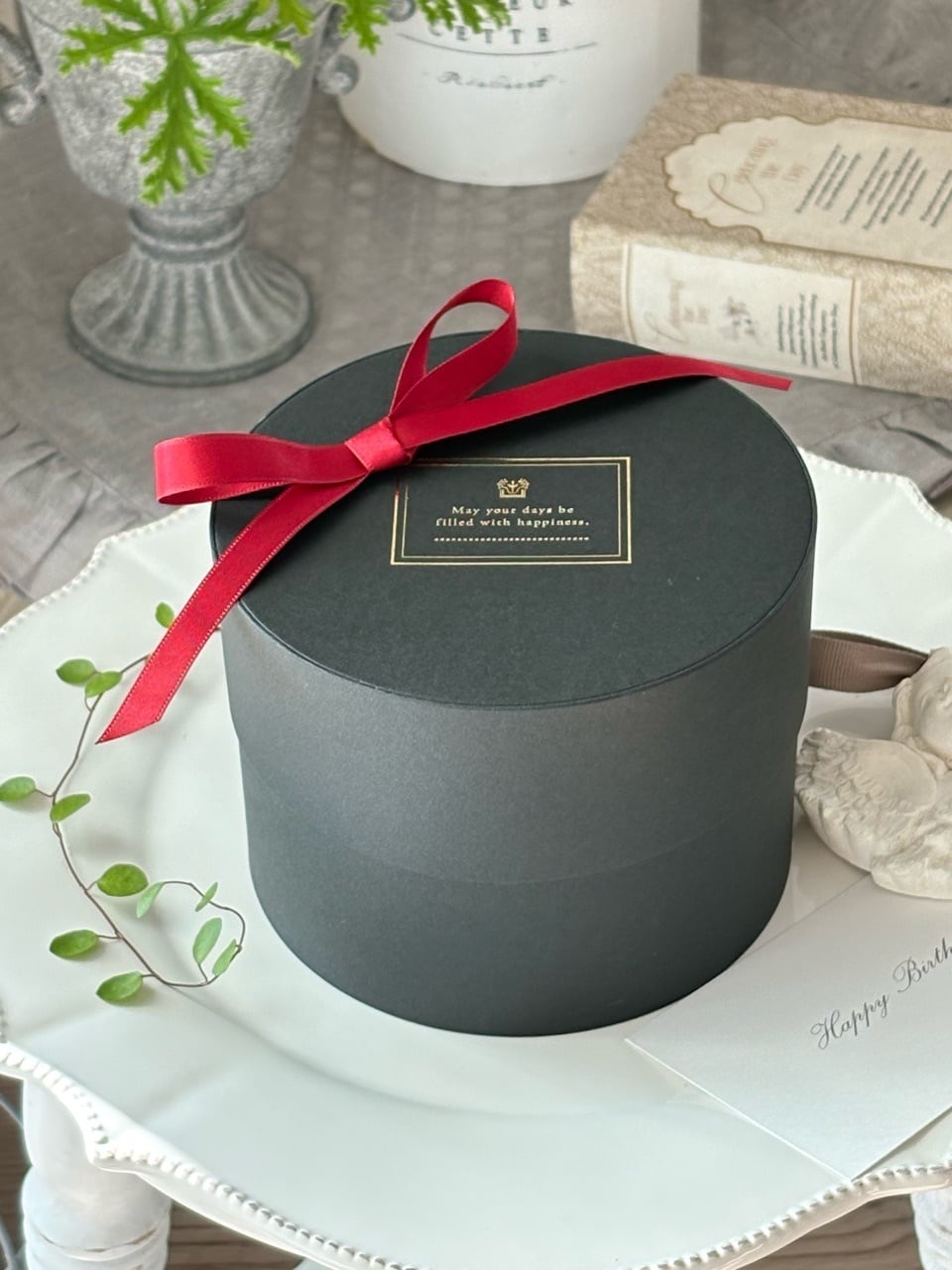 フタの部分にはダマスク模様が描かれており、英語で「あなたの日々が幸せで満たされますように」と書かれています。