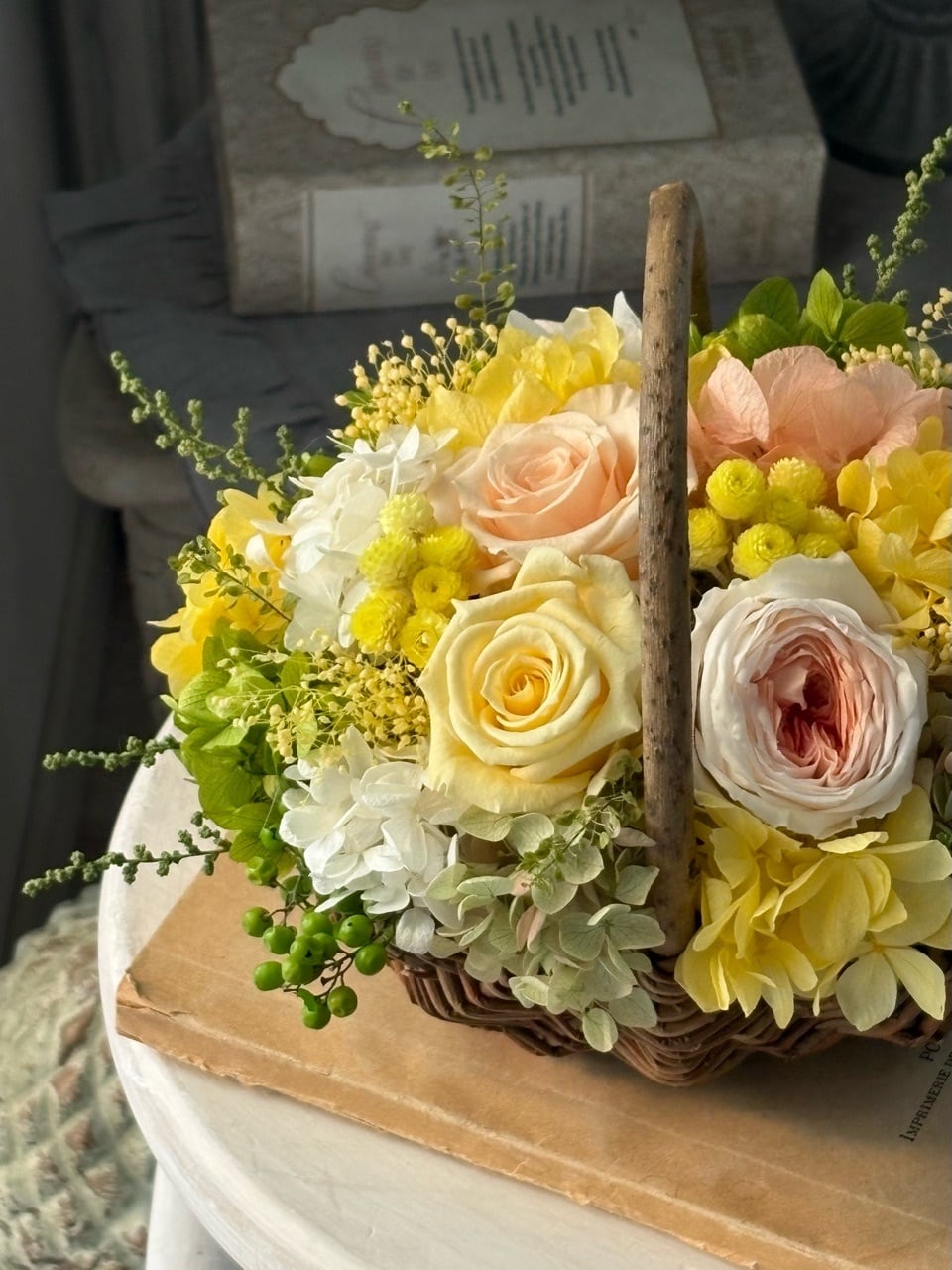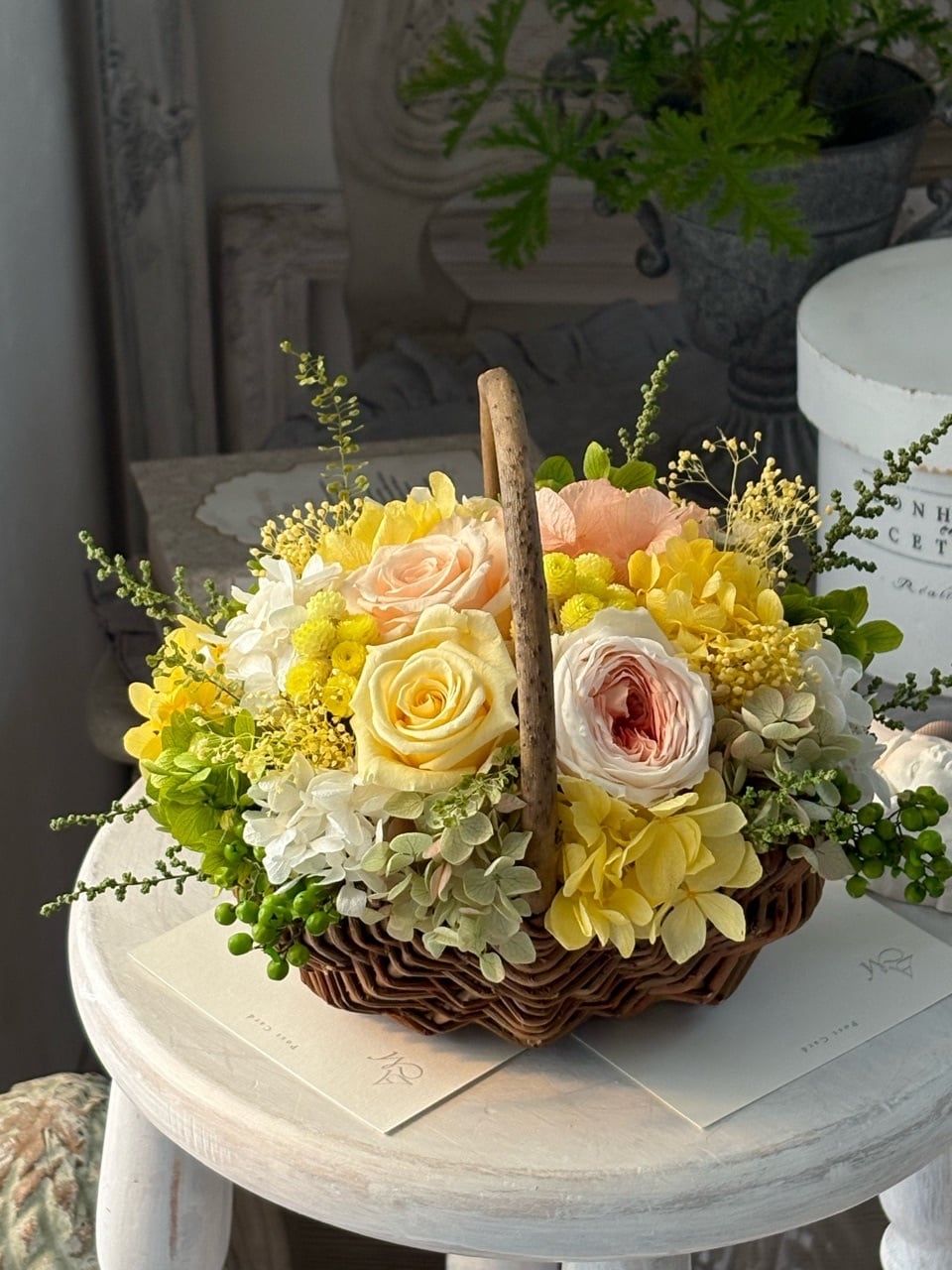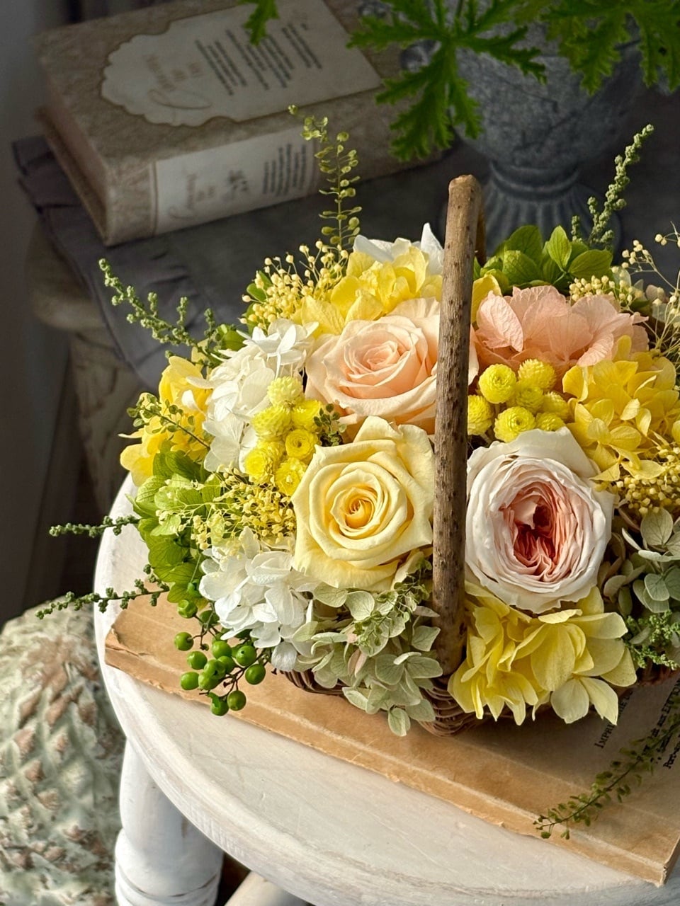 ●バラ1輪、オールドローズ1輪、スプレーバラ1輪、紫陽花4種類、ミニかすみ草、ペッパーベリー、イモーテル、ソフトストーベ、ペティコート、その他(すべてプリザーブドフラワー)