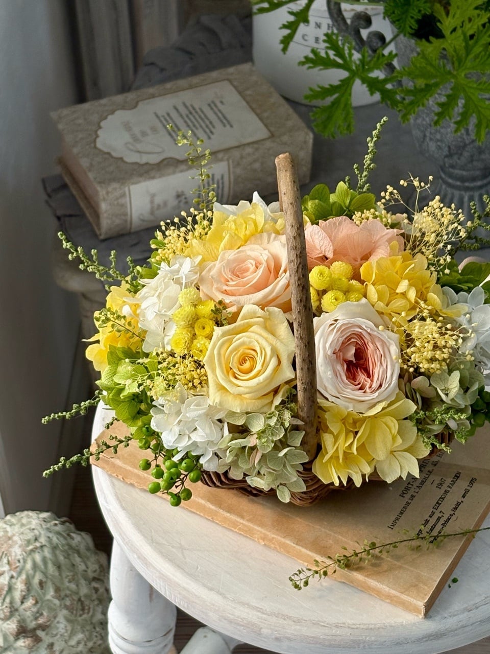 春色のバスケットアレンジメント/プリザーブドフラワー/お誕生日のお花/退職祝い/開店祝い/開業祝い/新築祝い/両親贈呈のお花/米寿祝い/ラッピング無料【お届け日時指定可能】【沖縄県・離島へのお届け不可】