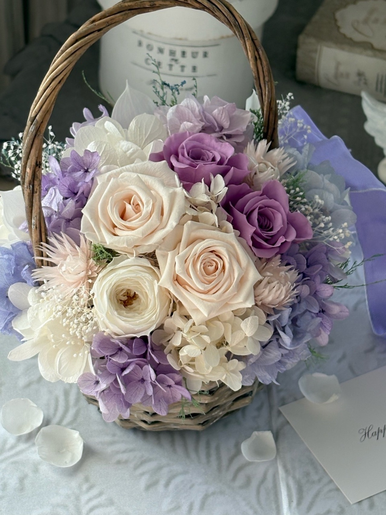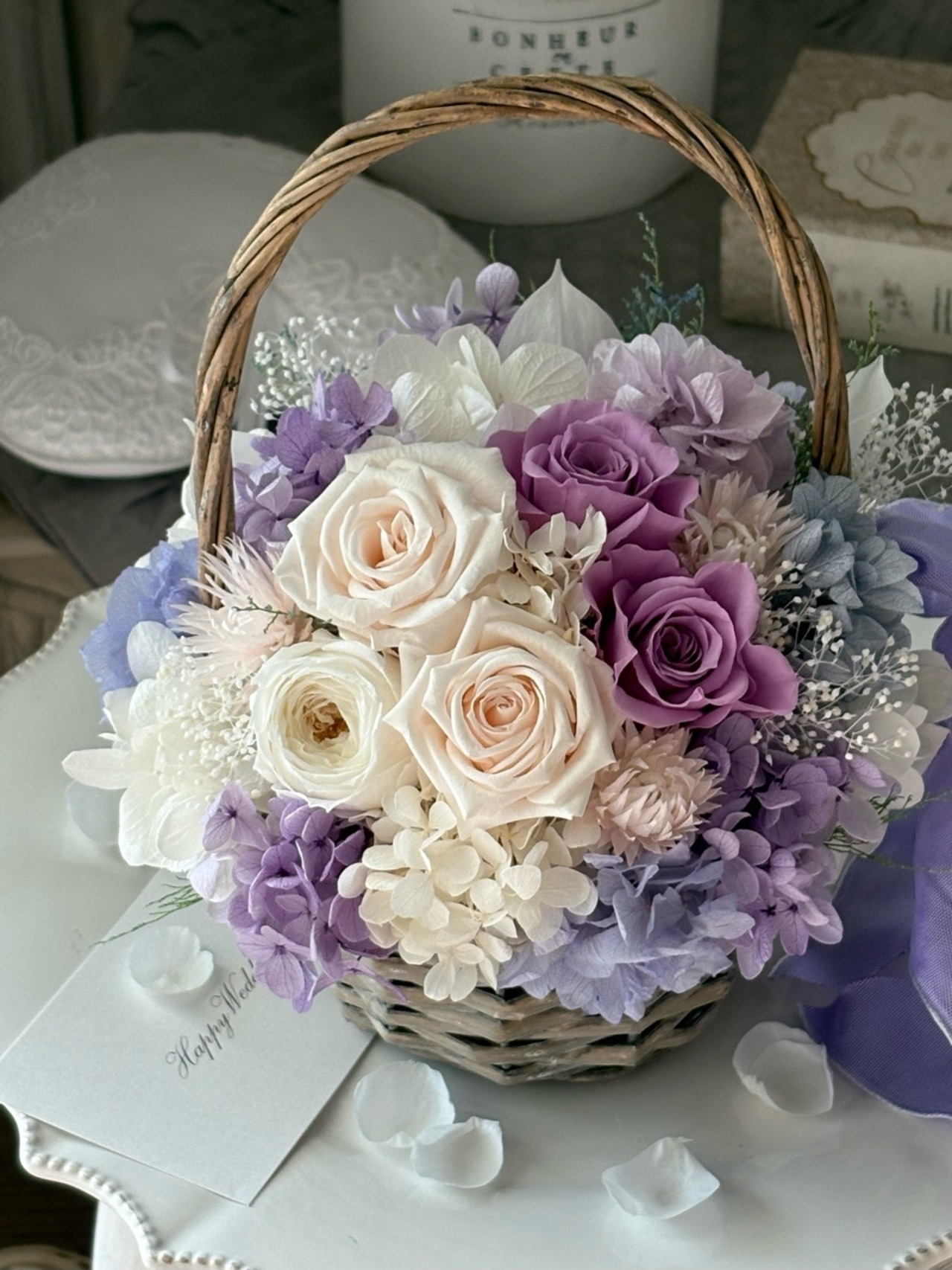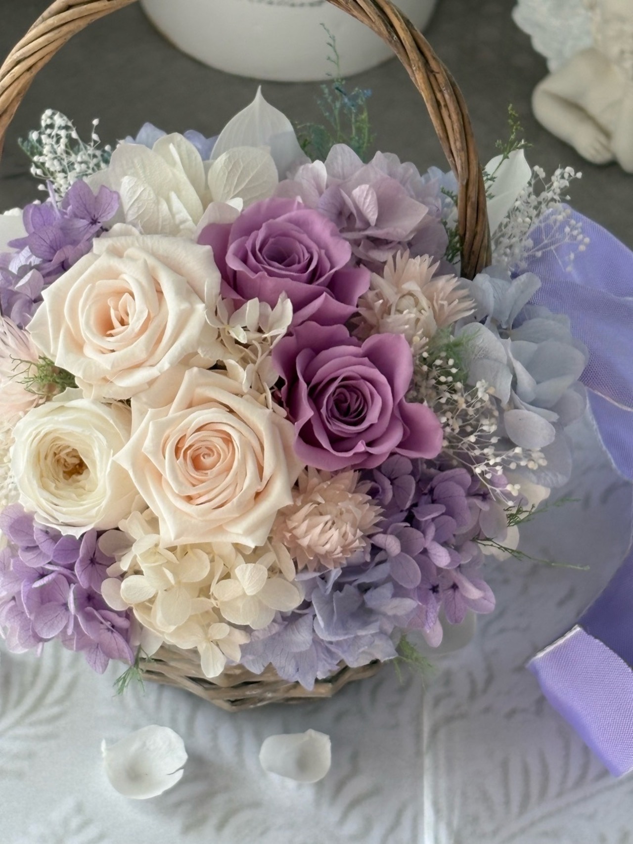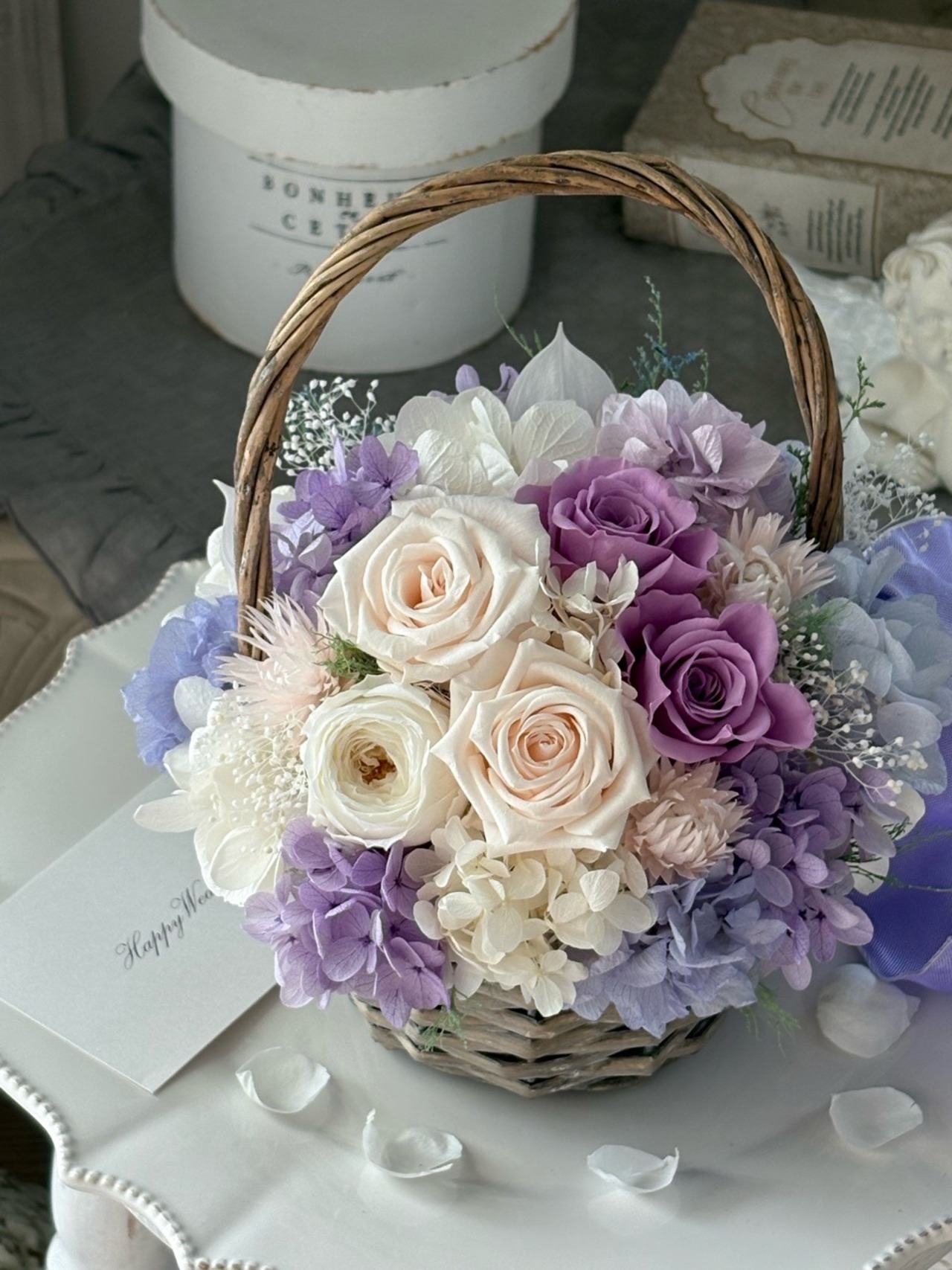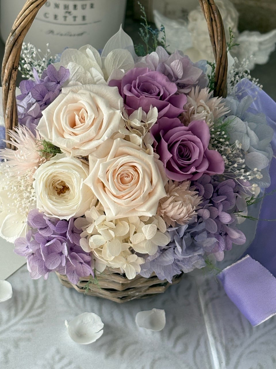 バラと紫陽花の花カゴアレンジメント/プリザーブドフラワー/ブルーライラック/ご結婚のお祝い/両親贈呈/ウェディング/お誕生日のお花/バースデーギフト/春の贈り物/送別のお花/卒業祝い/ホワイトデー/ラッピング無料【お届け日時指定可能】【沖縄県および離島へのお届け不可】