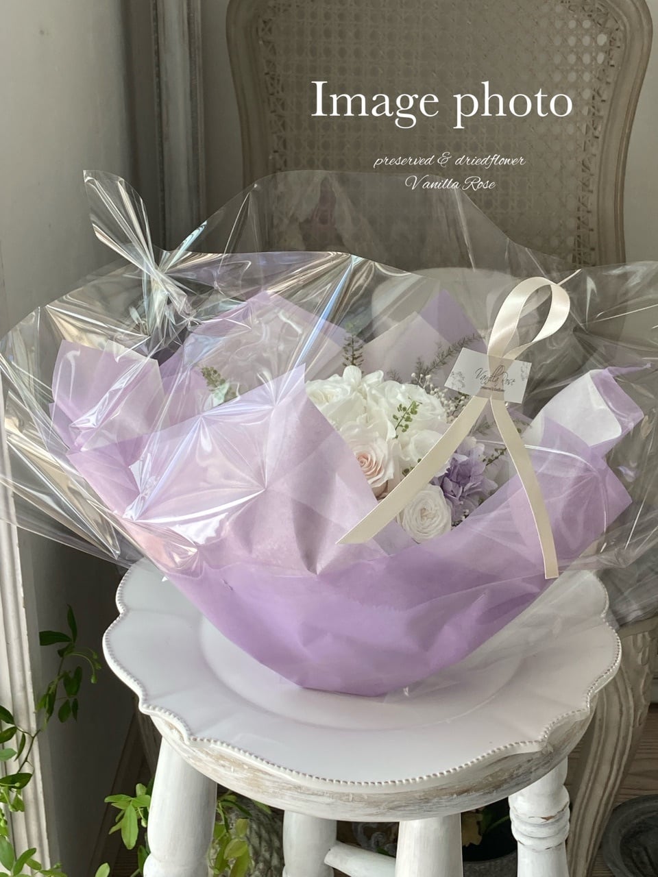 ●オールドローズ1輪、スプレーバラ4輪、紫陽花4種類、かすみ草、シルバーデージー、かすピア、ルスカスほか(すべてプリザーブドフラワー)ワイヤー入りリボン。