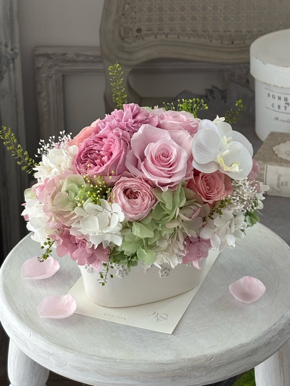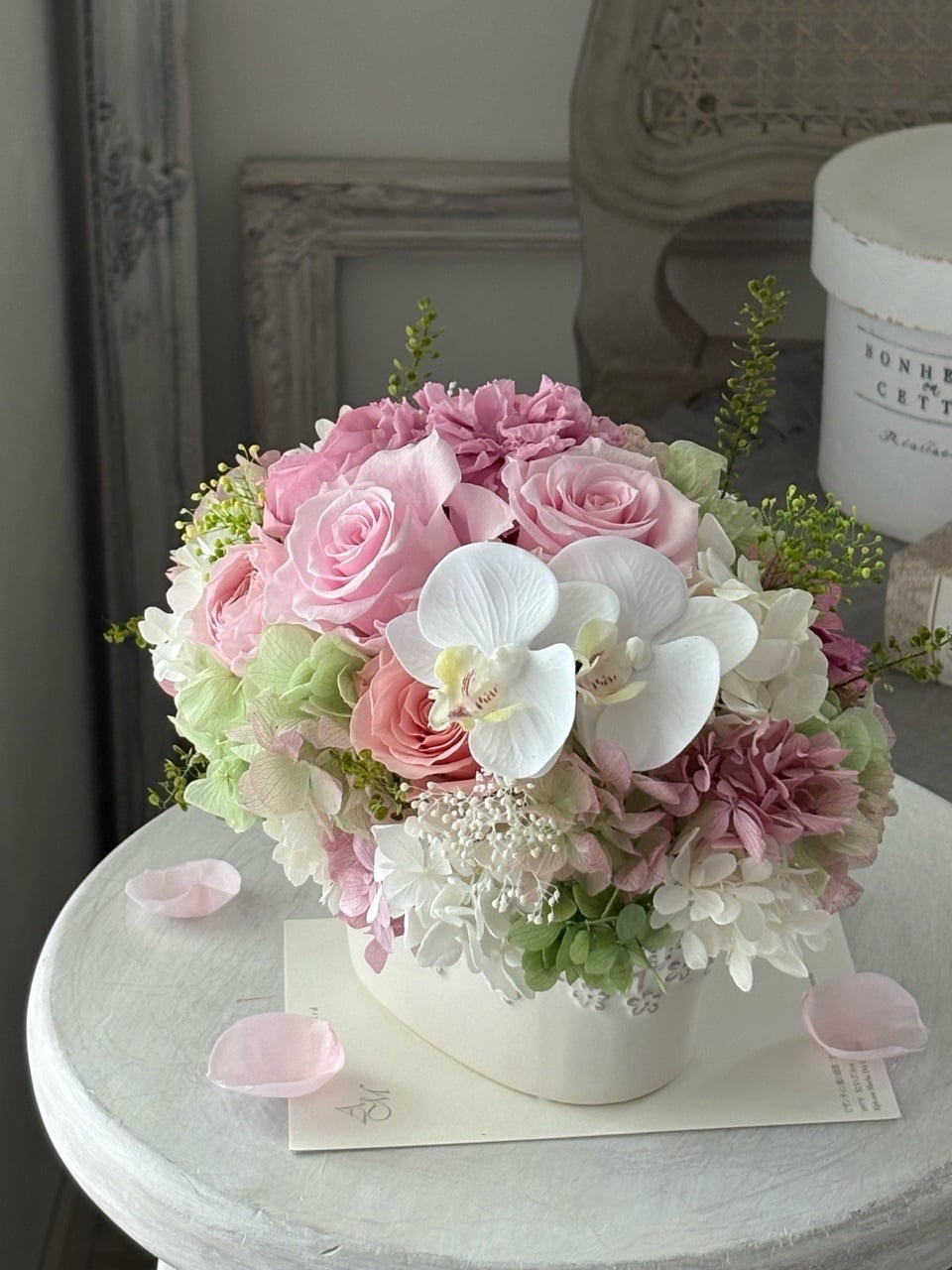 やわらかなピンクのバラを中心に、純白のミニ胡蝶蘭と淡いグリーンの紫陽花を合わせた、上品で春らしいプリザーブドフラワーアレンジメントです。