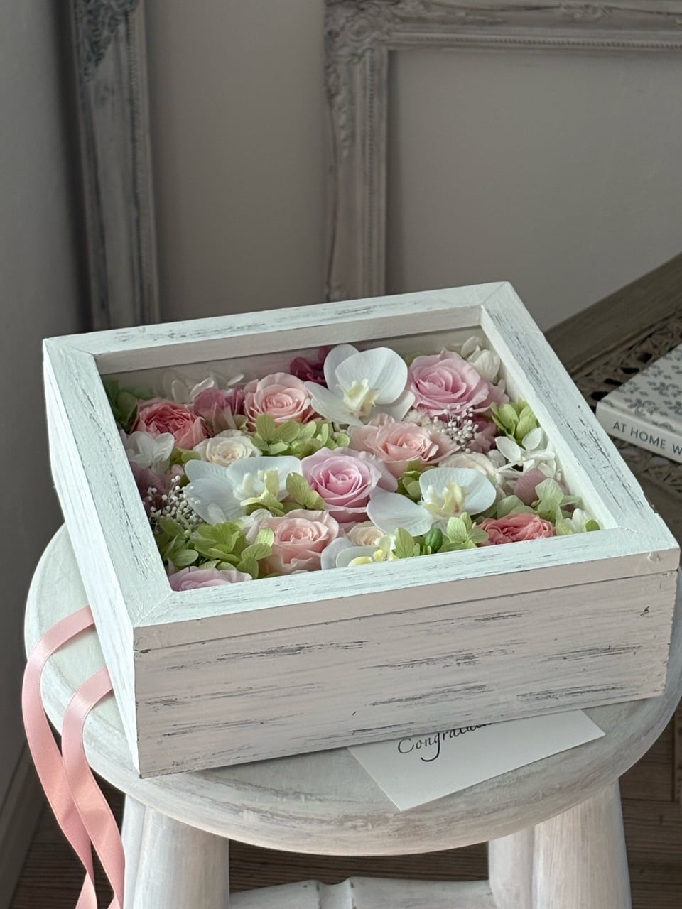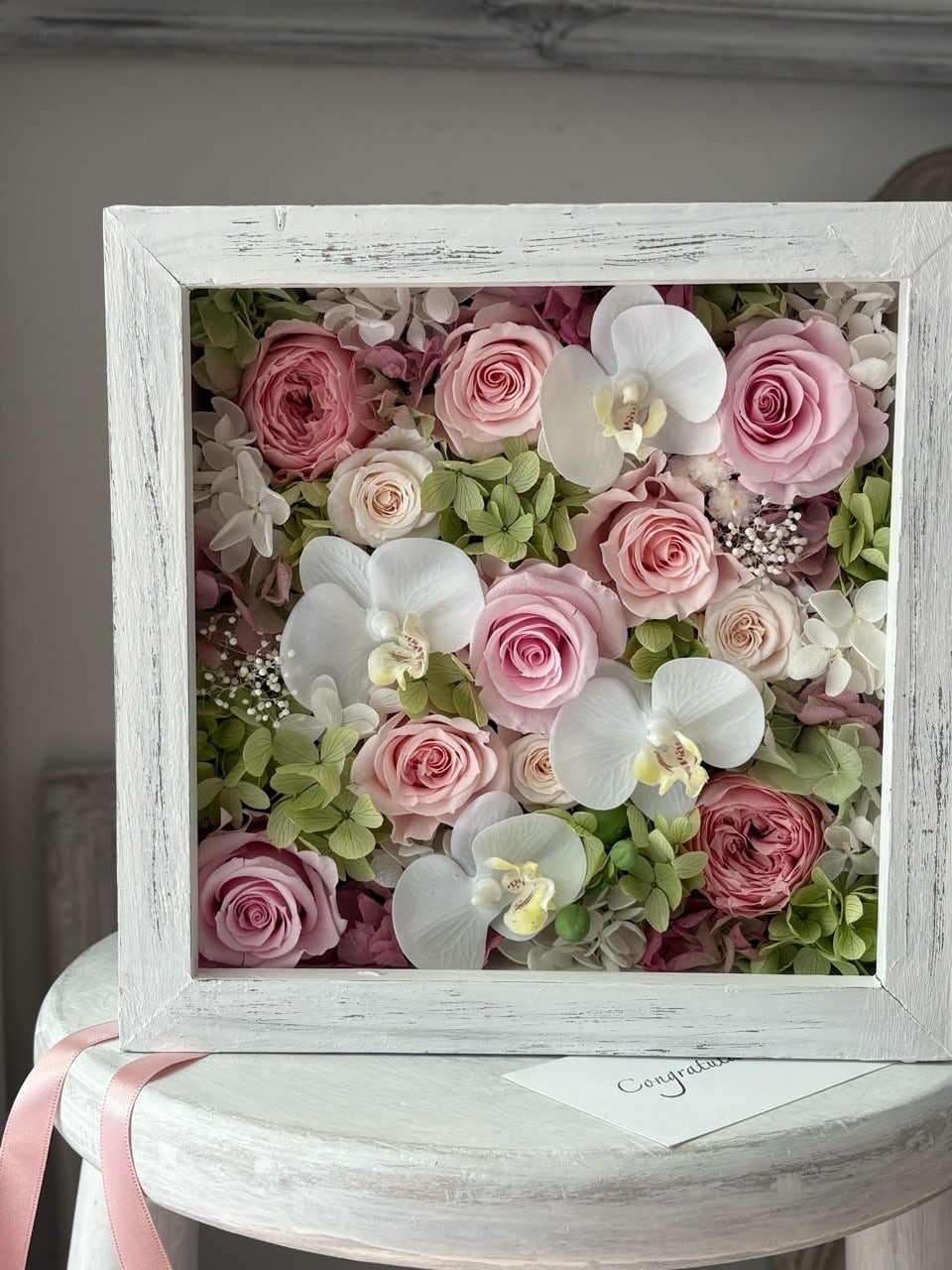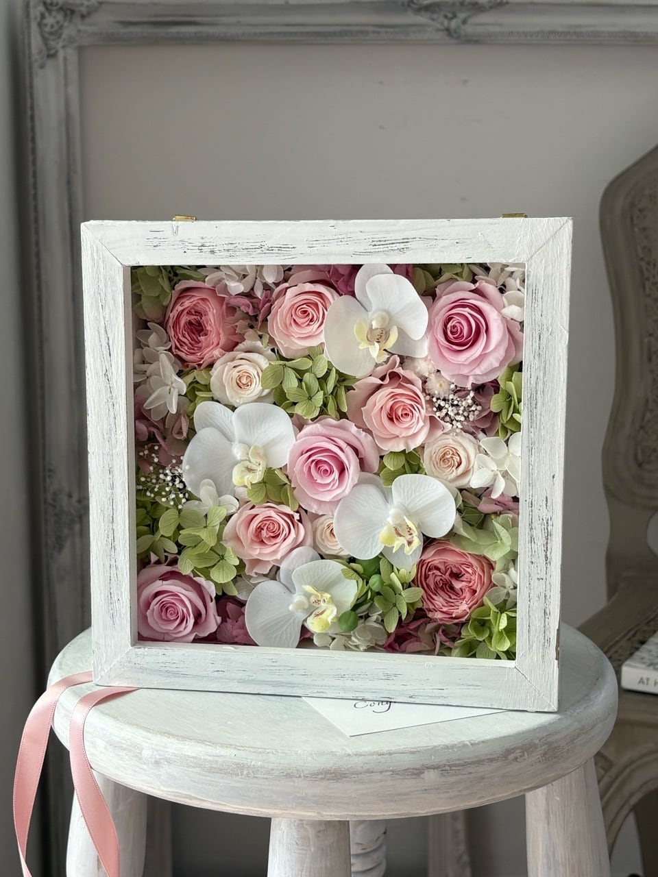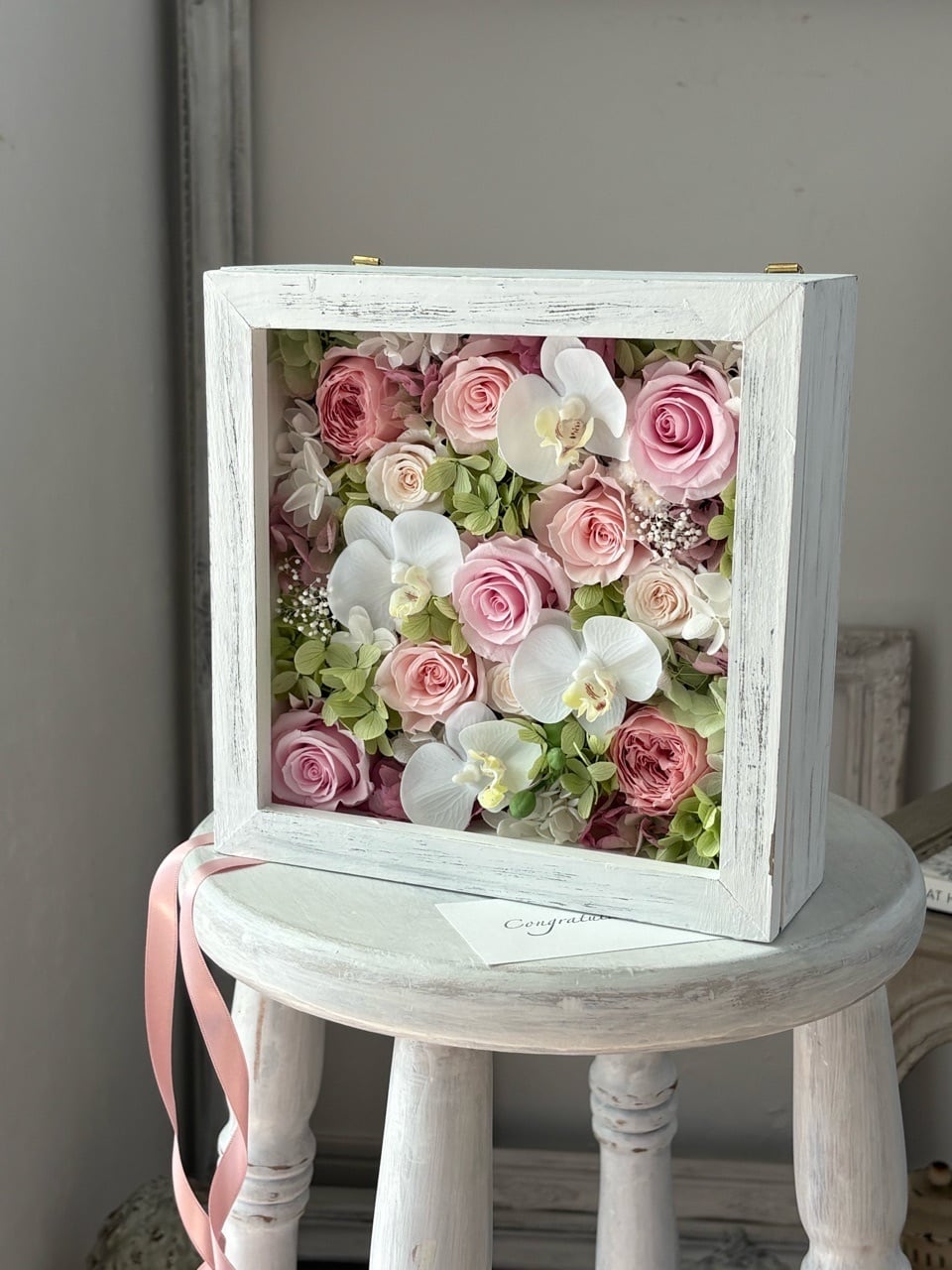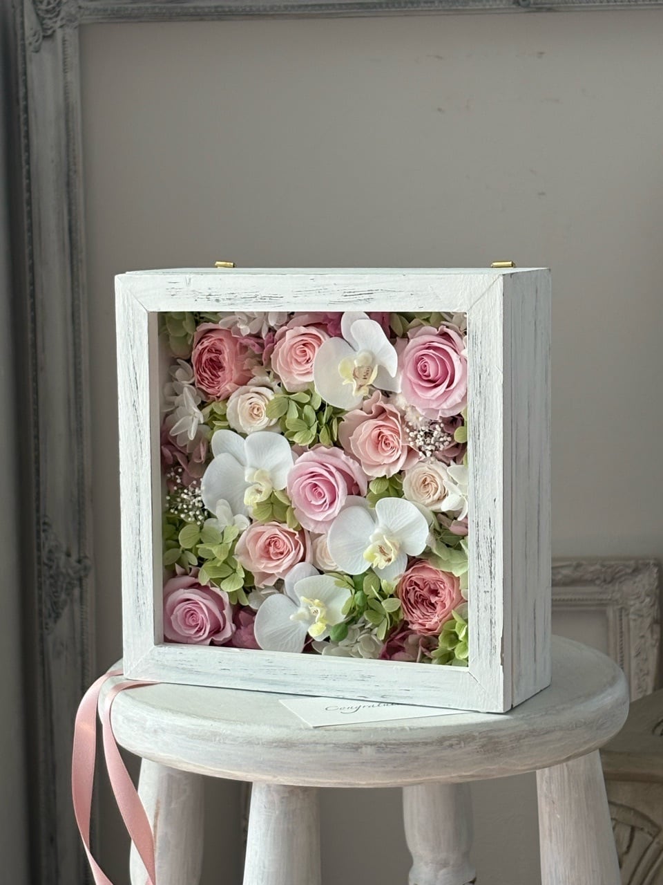 シャビー感のある白いフレームタイプのウッドボックスに、柔らかなピンクローズと気品あふれる胡蝶蘭を贅沢にあしらい、エレガントな雰囲気に仕上げました。