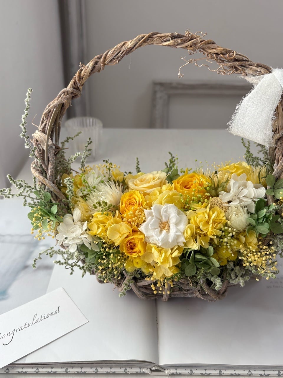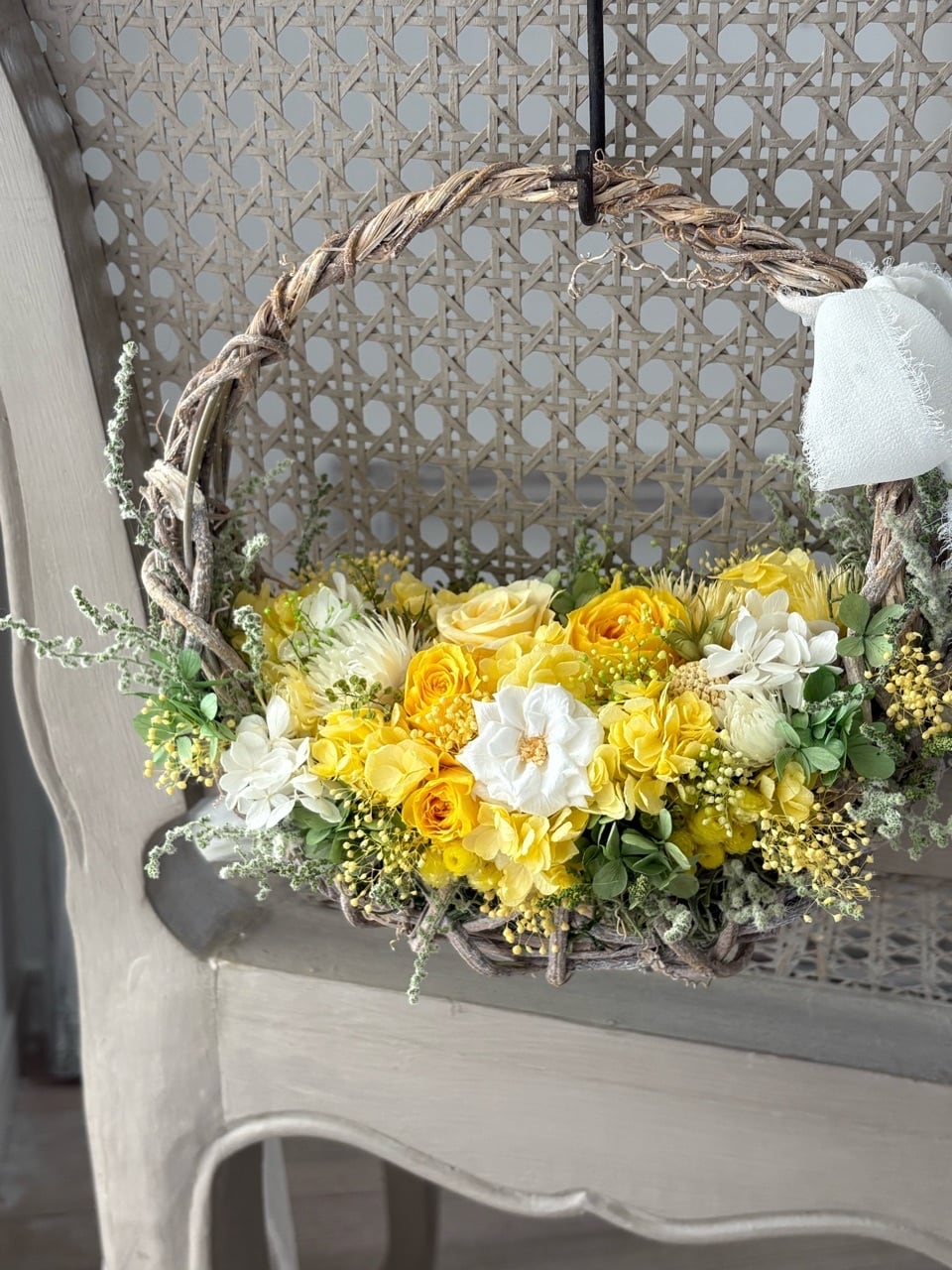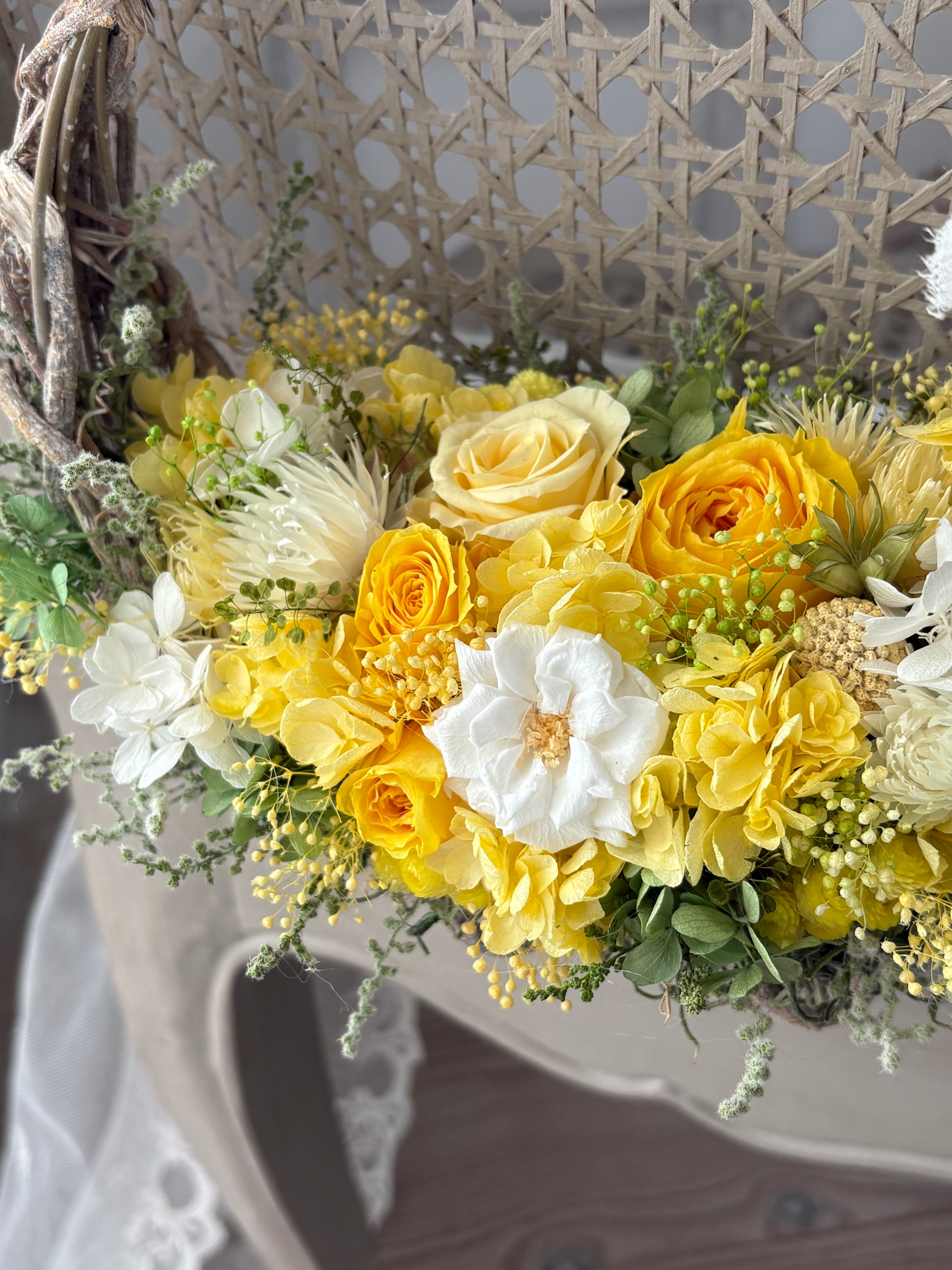陽だまり色のナチュラルバッグリース/プリザーブドフラワー/リース/ミモザの日/退職祝い/開店祝い/開業祝い/新築祝い/新居祝い/ご結婚祝い/春のお祝い/ホワイトデー/ラッピング無料【お届け日時指定可能】【沖縄県および離島へのお届け不可】
