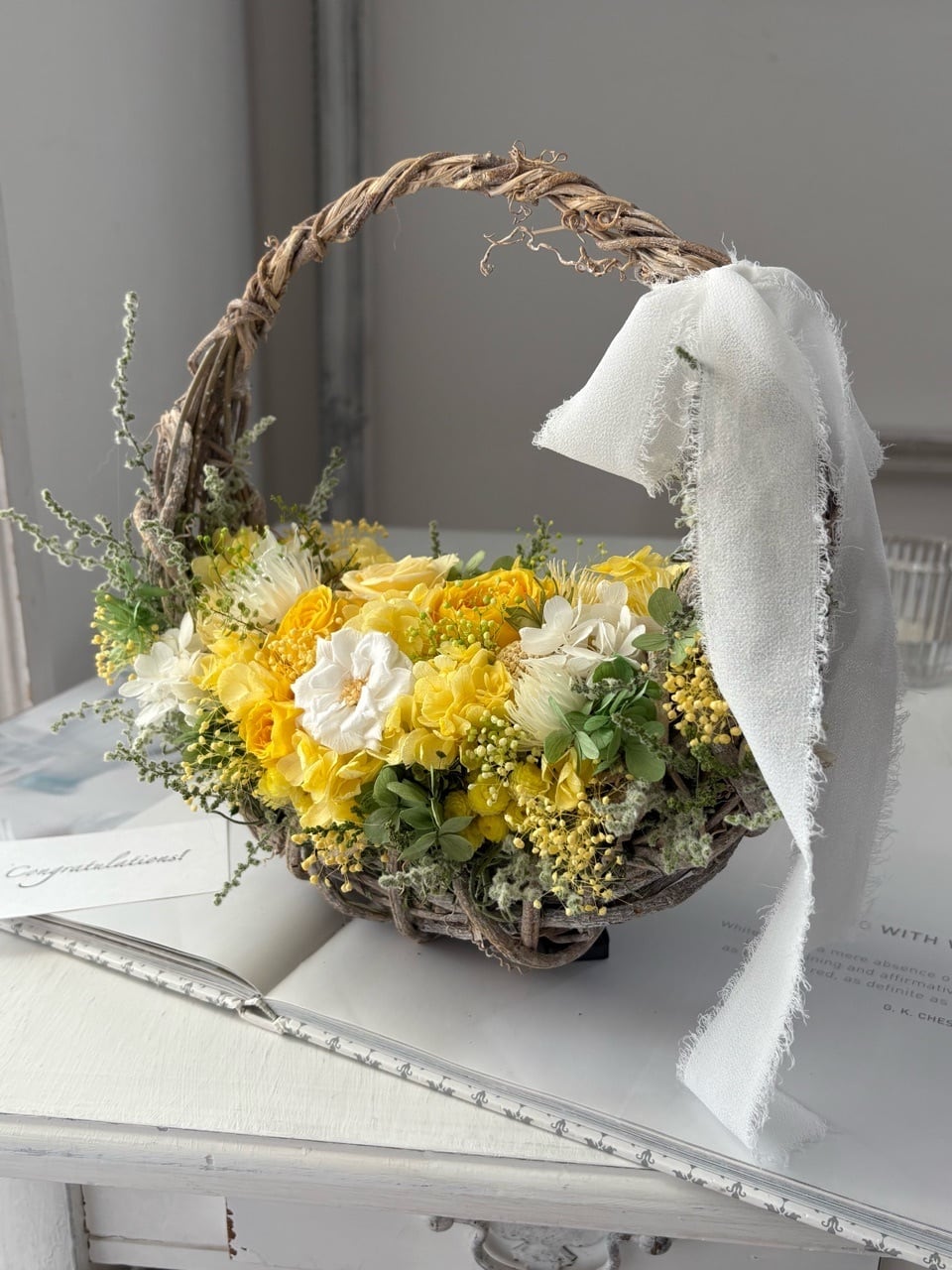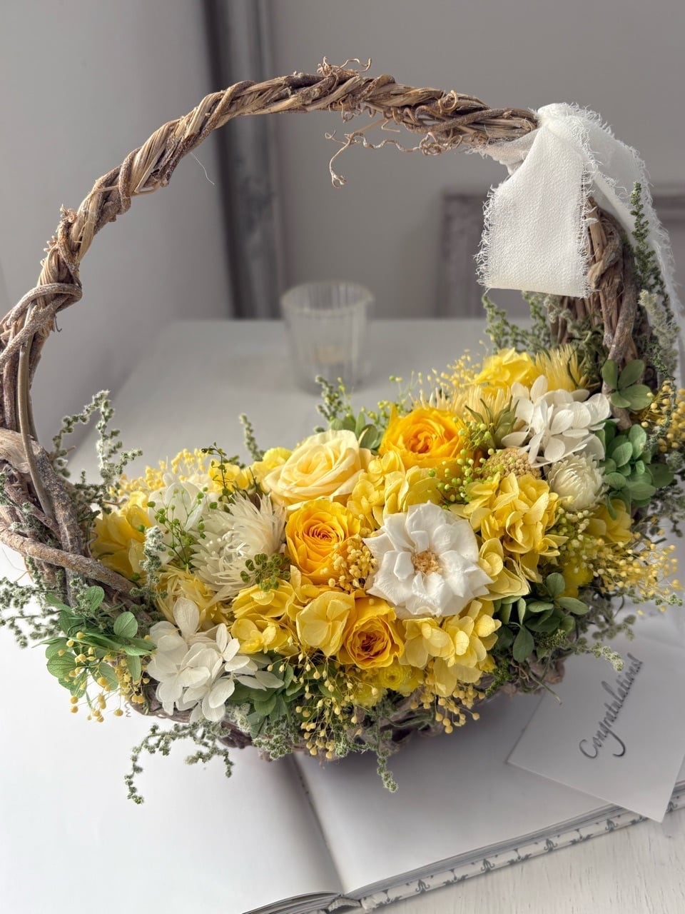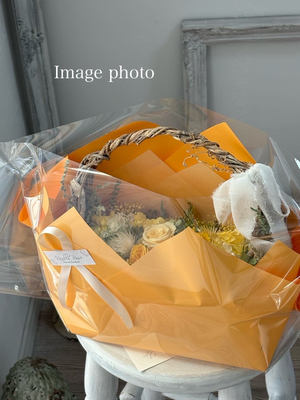 陽だまり色のナチュラルバッグリース/プリザーブドフラワー/リース/ミモザの日/退職祝い/開店祝い/開業祝い/新築祝い/新居祝い/ご結婚祝い/春のお祝い/ホワイトデー/ラッピング無料【お届け日時指定可能】【沖縄県および離島へのお届け不可】