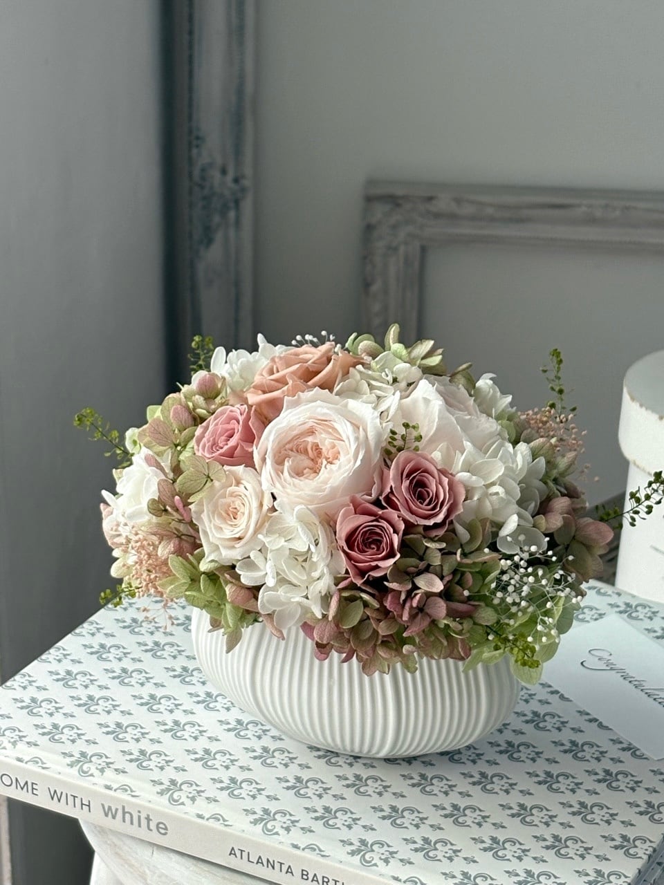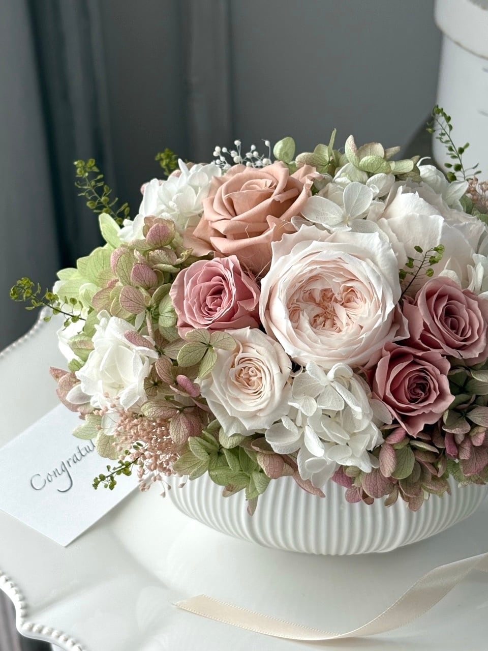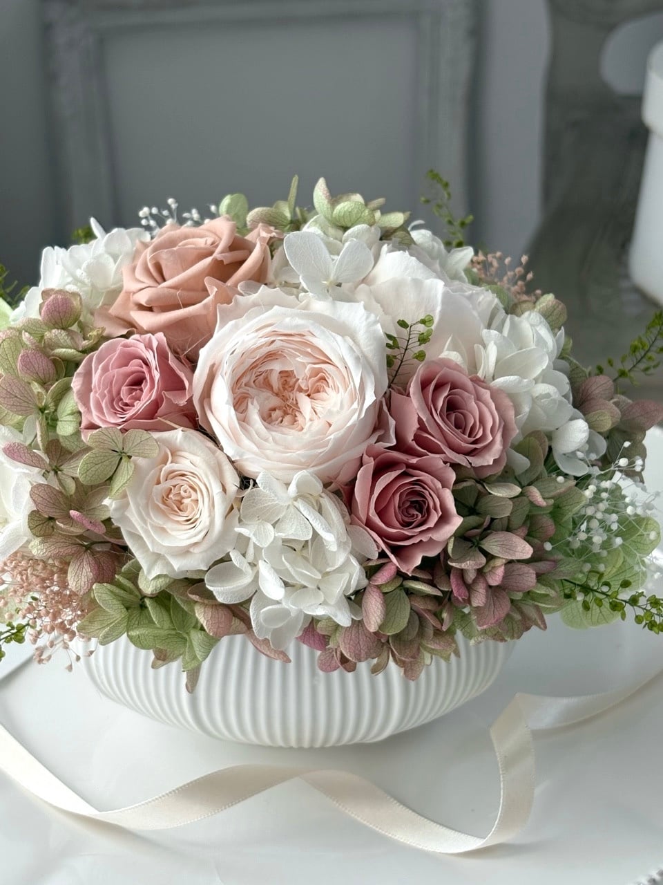 シャンパンホワイトのオールドローズにモーブピンクのミニバラ、淡いグリーンの紫陽花を合わせたニュアンスカラーのアレンジメントです。