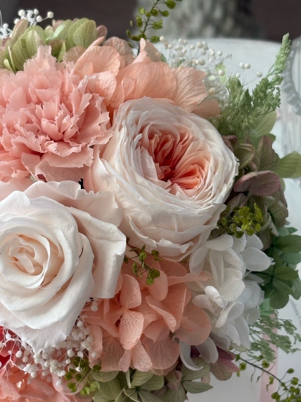 ●バラ1輪、スプレーバラ2輪、オールドローズ1輪、カーネーション1輪、紫陽花4種類、かすみ草、カスピア、ペティコートほか。(すべてプリザーブドフラワー)サテンリボン。