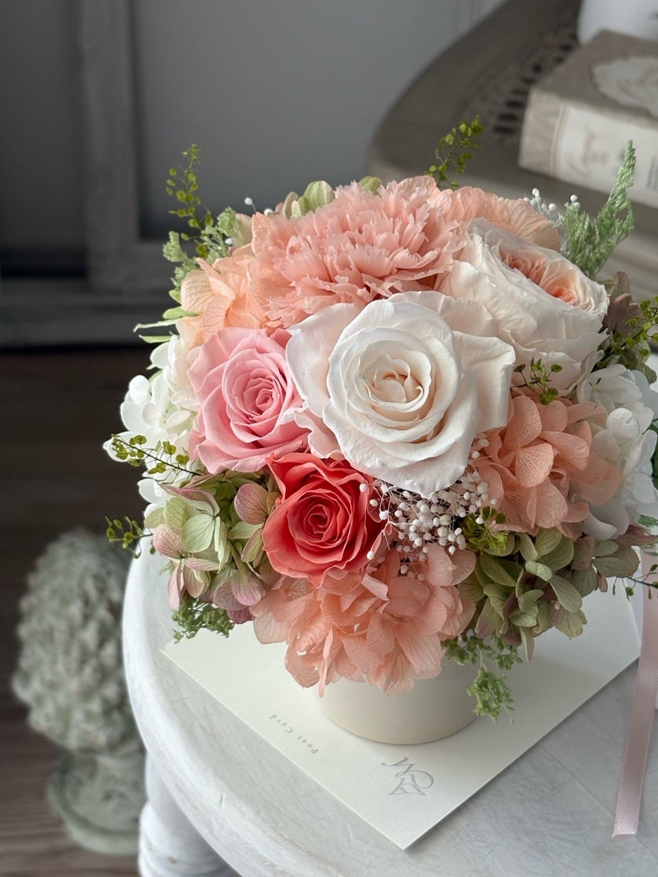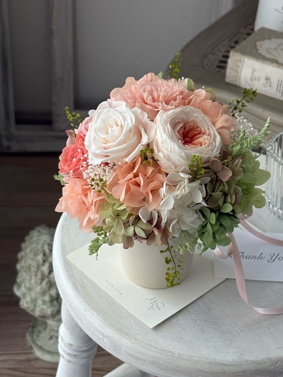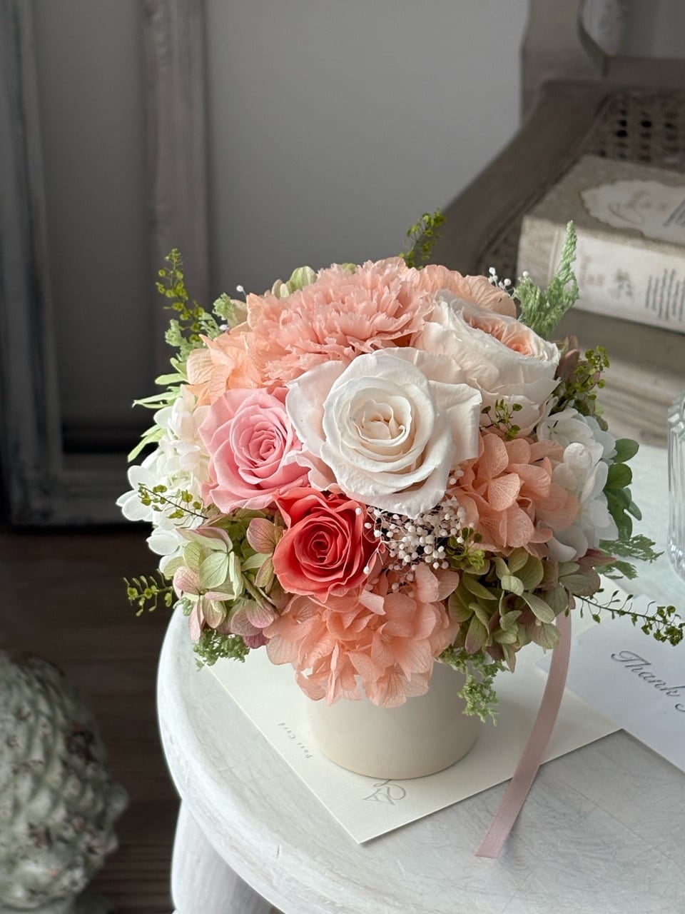 サーモンピーチのポットアレンジメント/プリザーブドフラワー/退職祝い/開店祝い/開業祝い/新築祝い/新居祝い/ご結婚祝い/春のお祝い/ホワイトデー/ラッピング無料【お届け日時指定可能】【沖縄県および離島へのお届け不可】