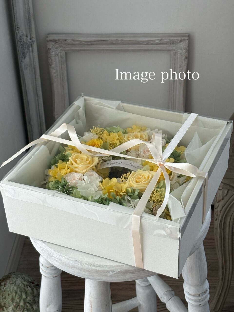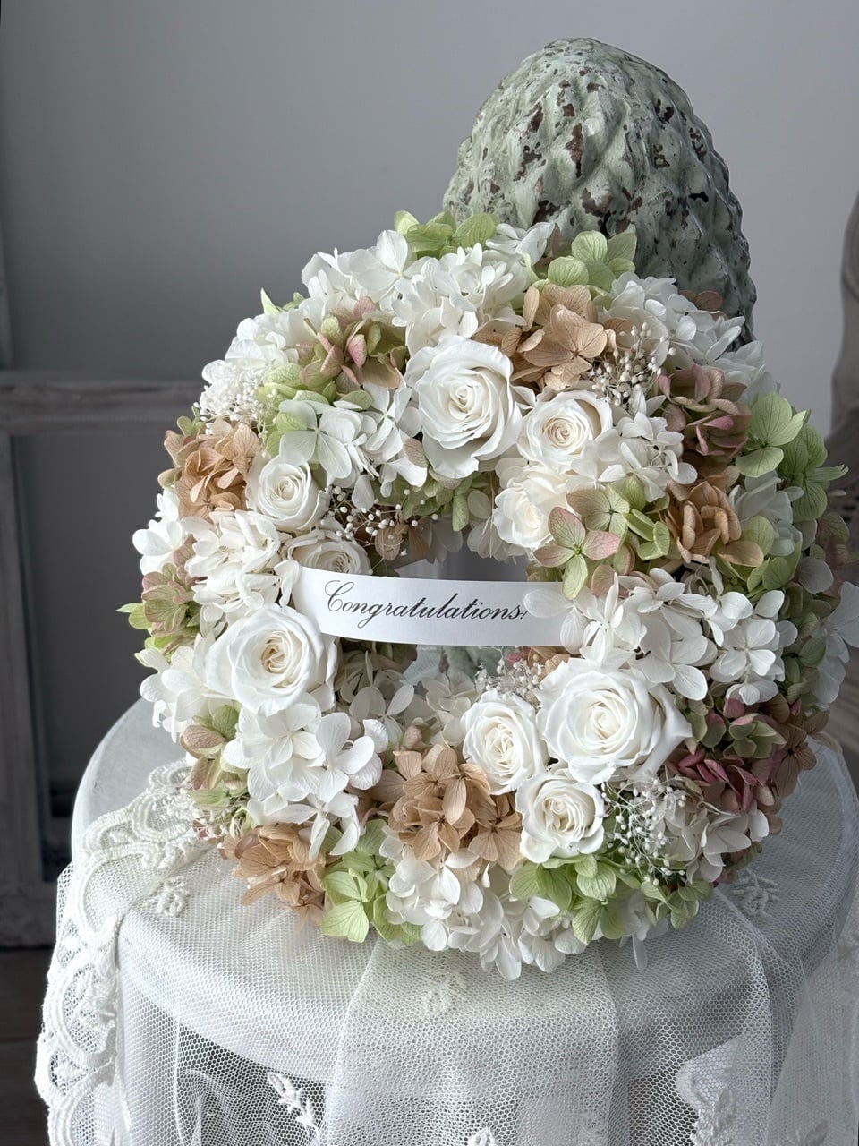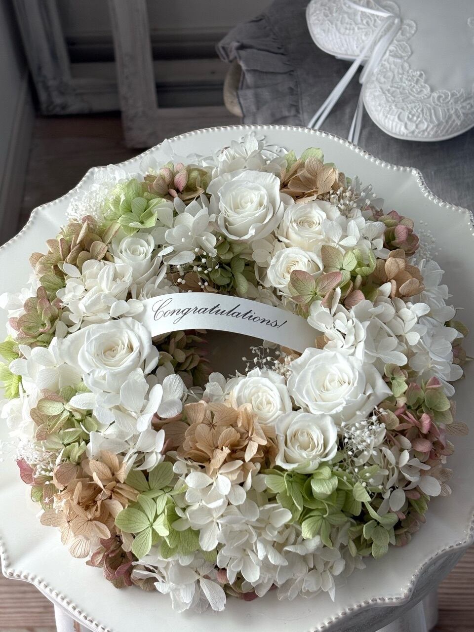 アンティークホワイトのリース/プリザーブドフラワーリース/直径22cm/リース/壁掛け/ご結婚祝い/開店祝い/お誕生日祝い/両親贈呈品/バースデーギフト/リースボックスつき/ギフト包装【お届け日時指定可能】【沖縄県・離島へのお届け不可】