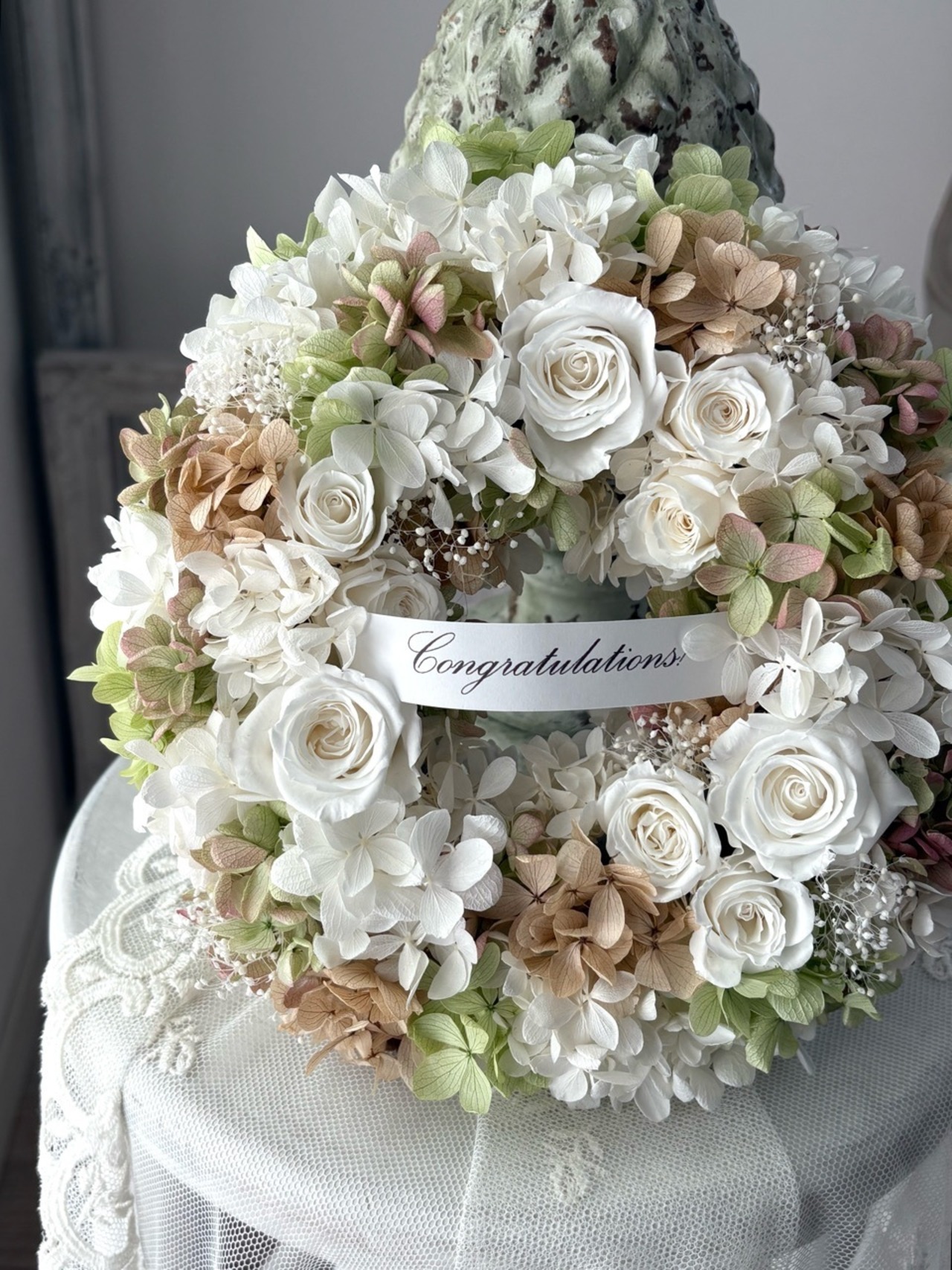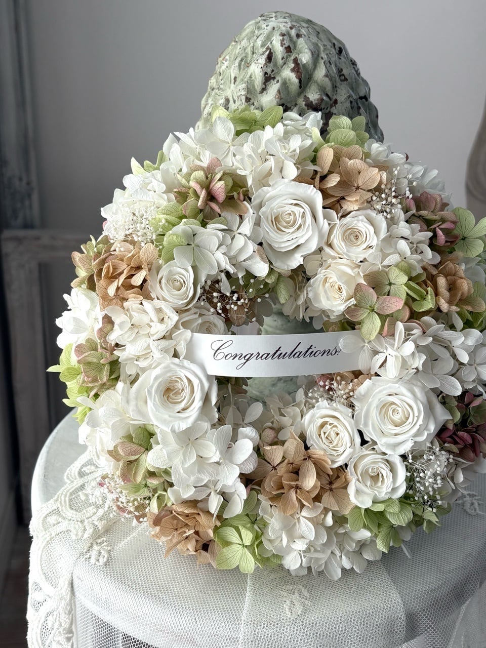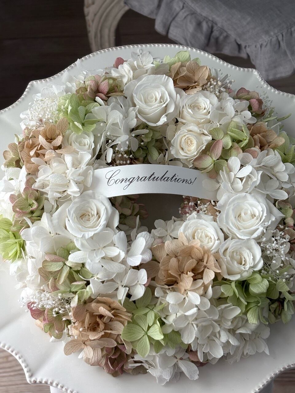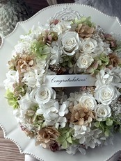 開業・開店祝いや新居祝いの贈り物におすすめの上品なプリザーブドフラワーリースです。