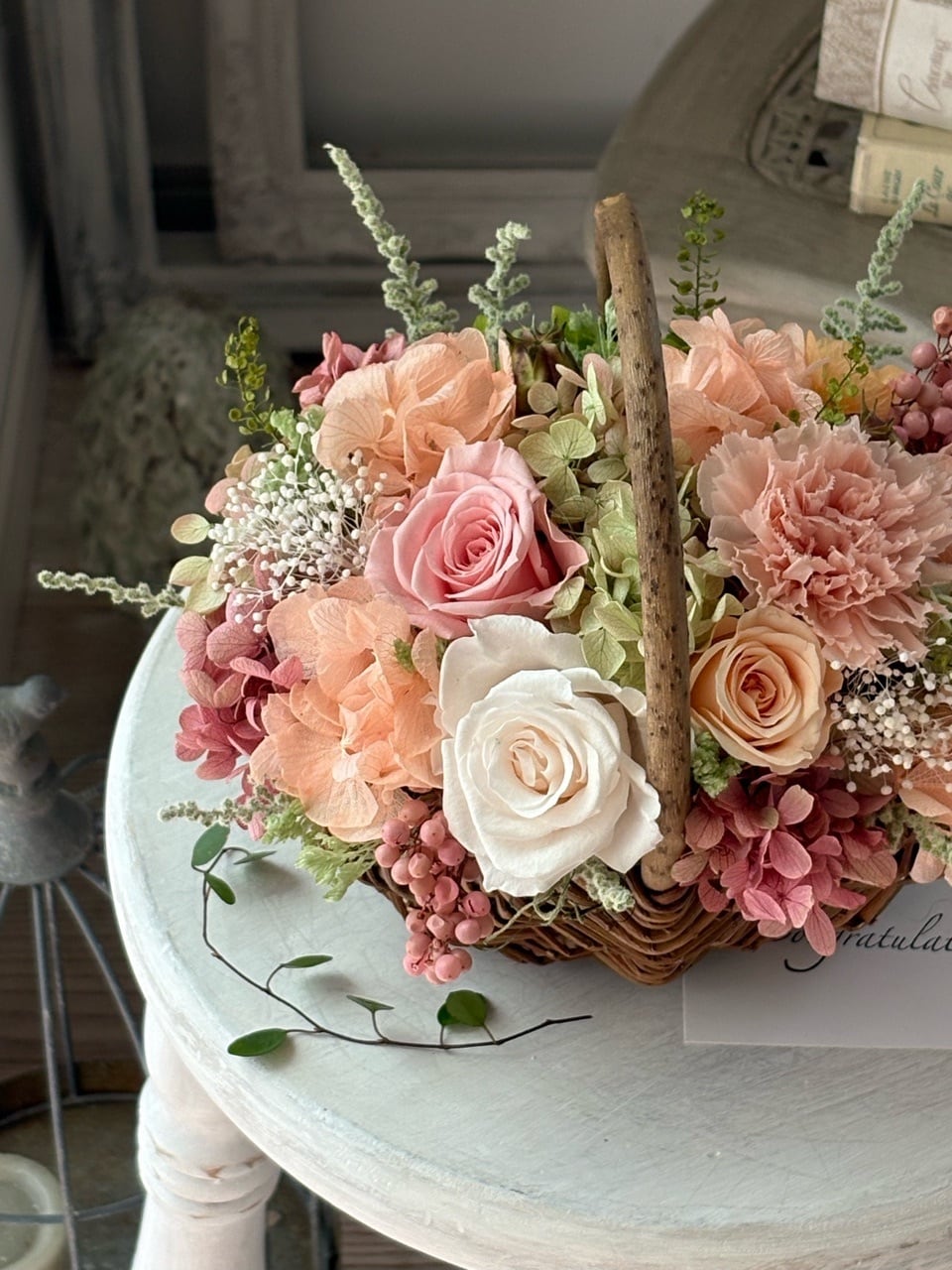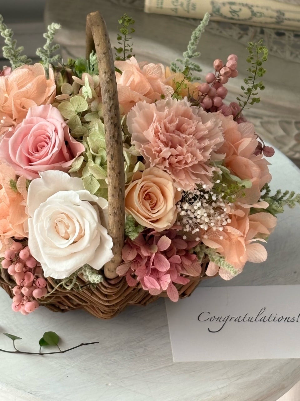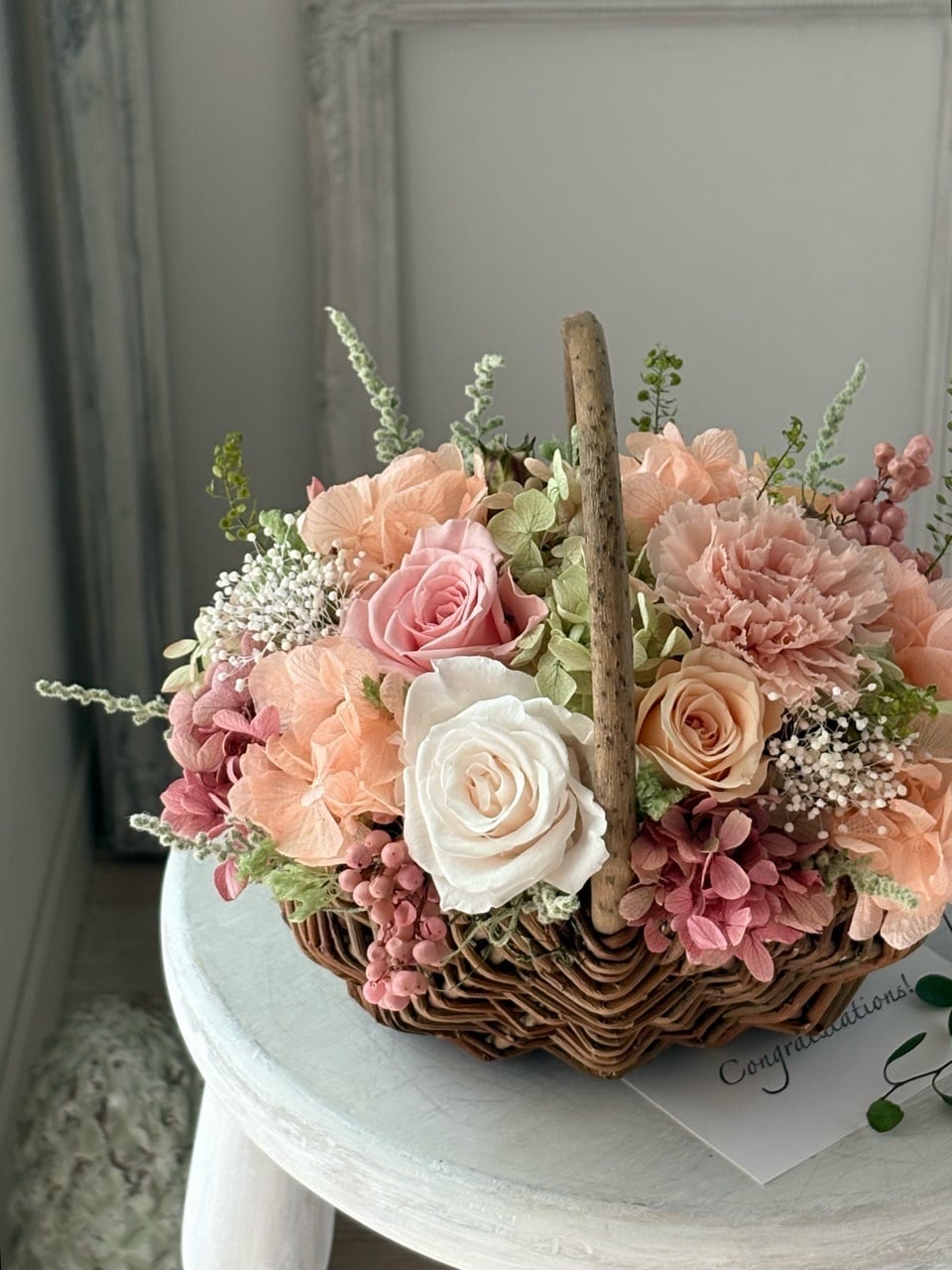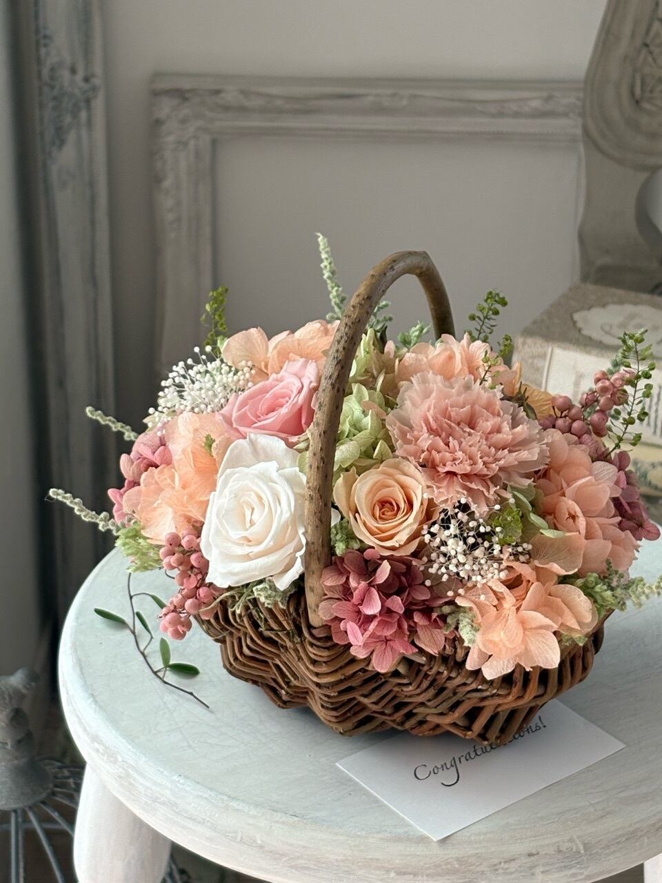 ナチュラルなバスケットにピーチピンク系のバラやカーネーションと、紫陽花をふんわりと合わせ、感謝やこれからの幸せを願う気持ちを表現しました。