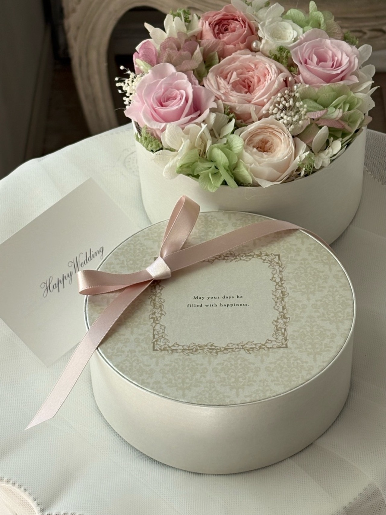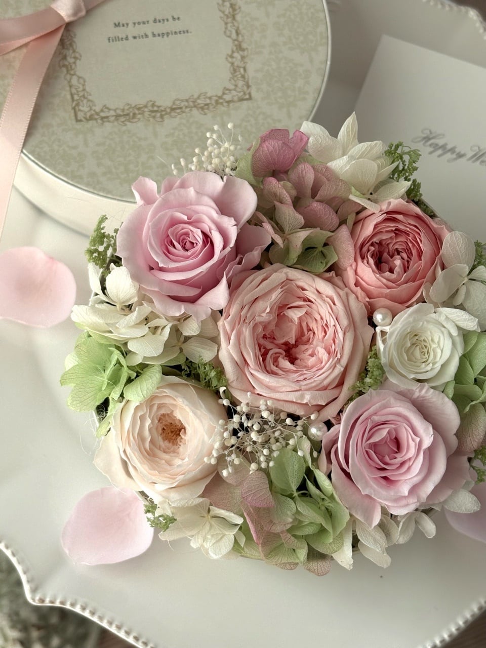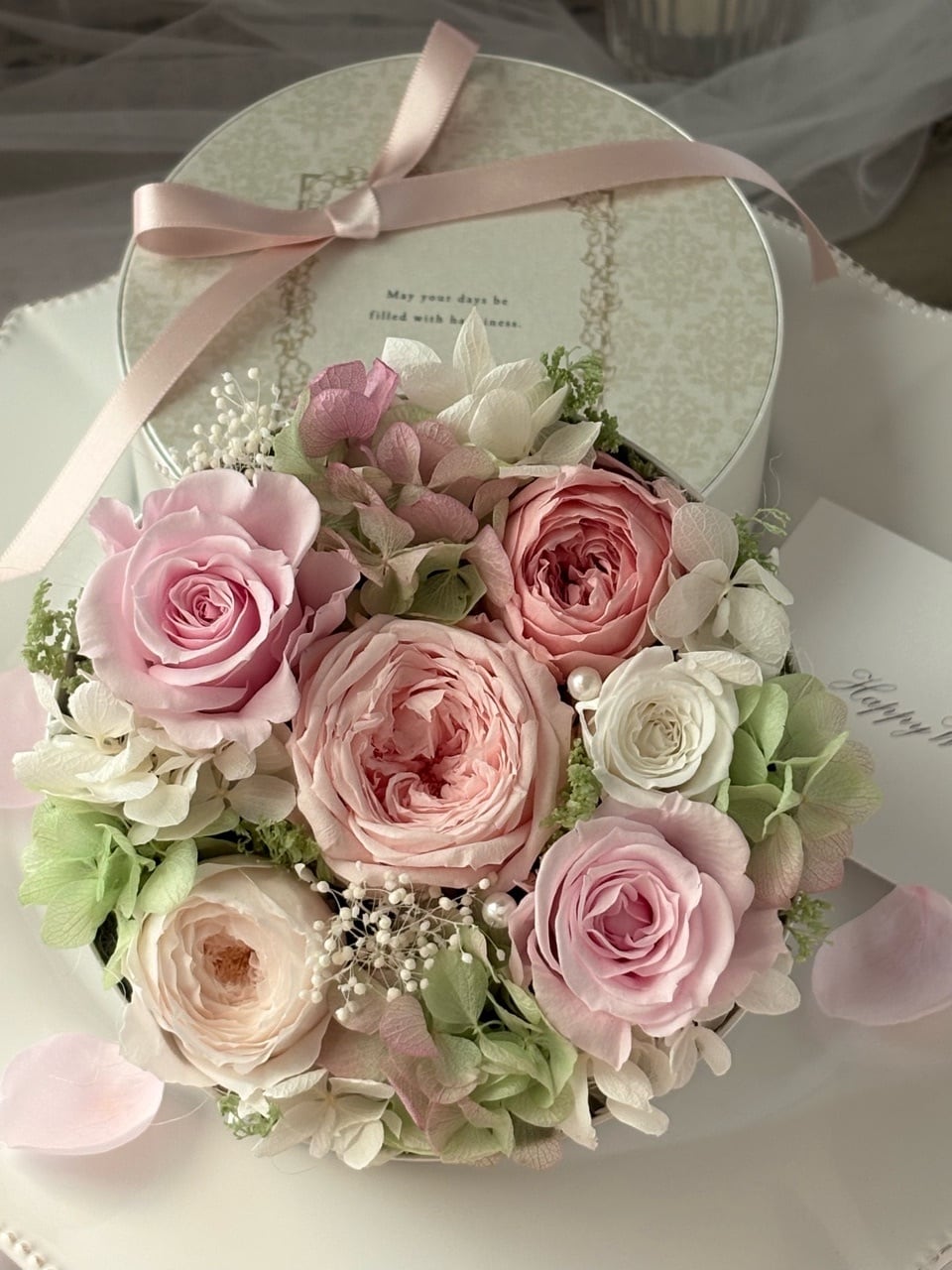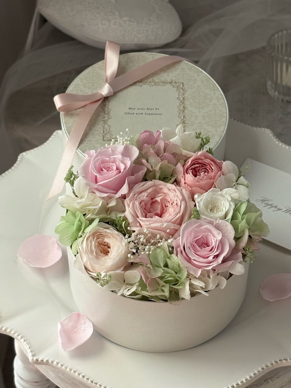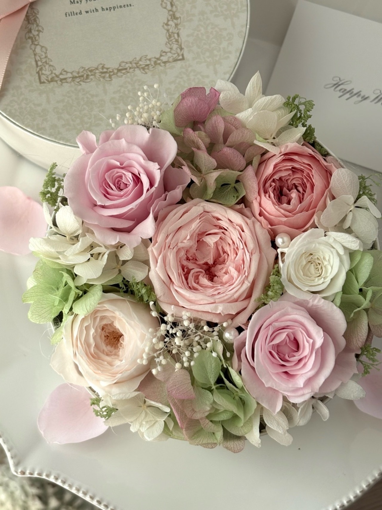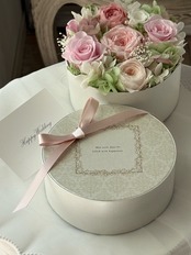 白い丸型のBOXに、ピンク×ホワイトのバラと淡いグリーンの紫陽花で上品にまとめた春色のBOXフラワーギフトです。