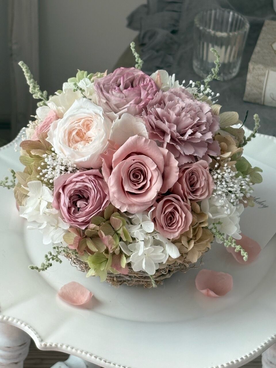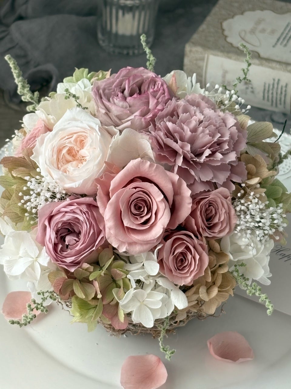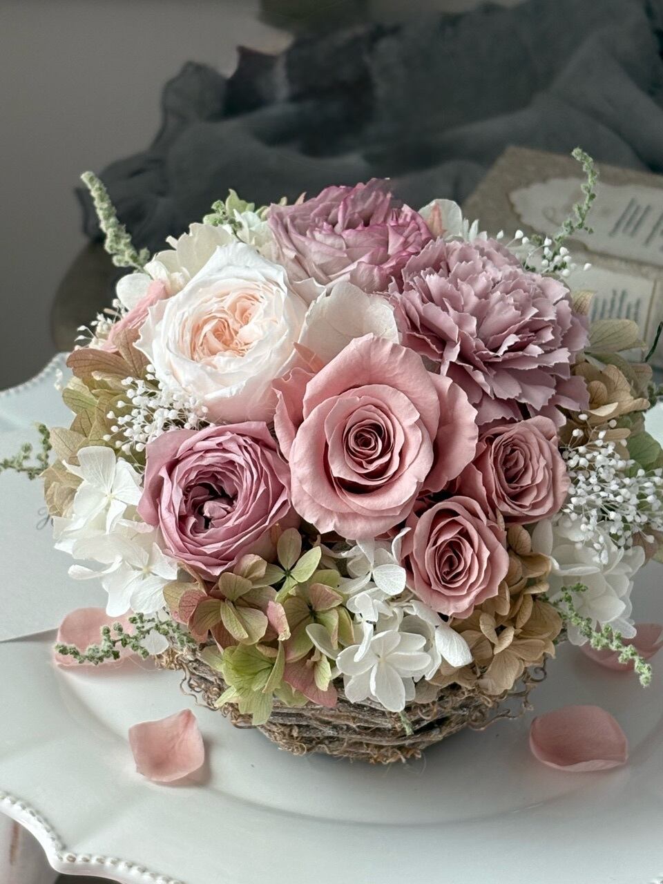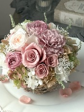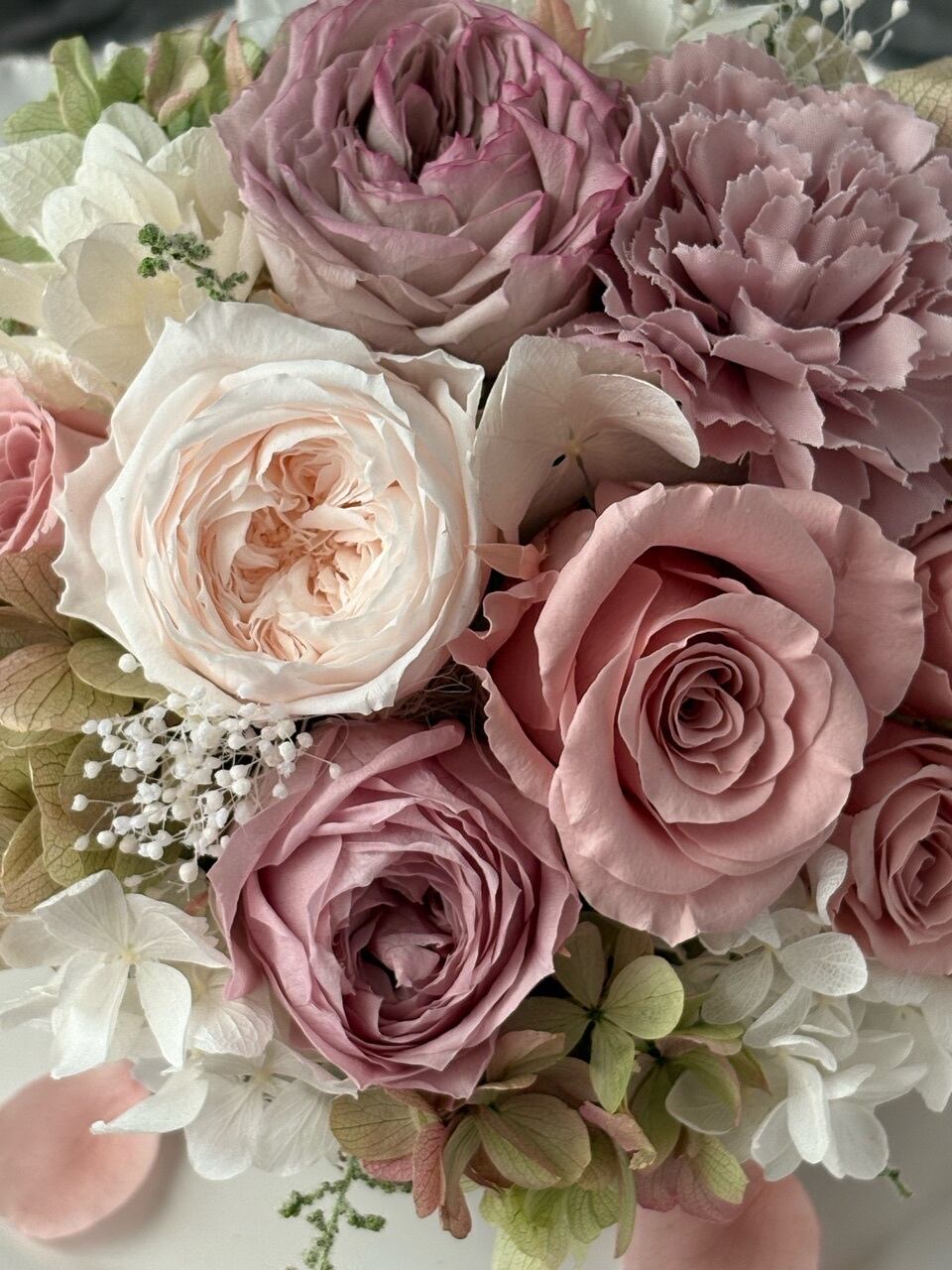 ●バラ1輪、オールドローズ1輪、オールドローズ(小)2輪、ミニバラ3輪、紫陽花4種類、かすみ草、ストーベほか(プリザーブドフラワー)カーネーション1輪(アーティフィシャルフラワー)