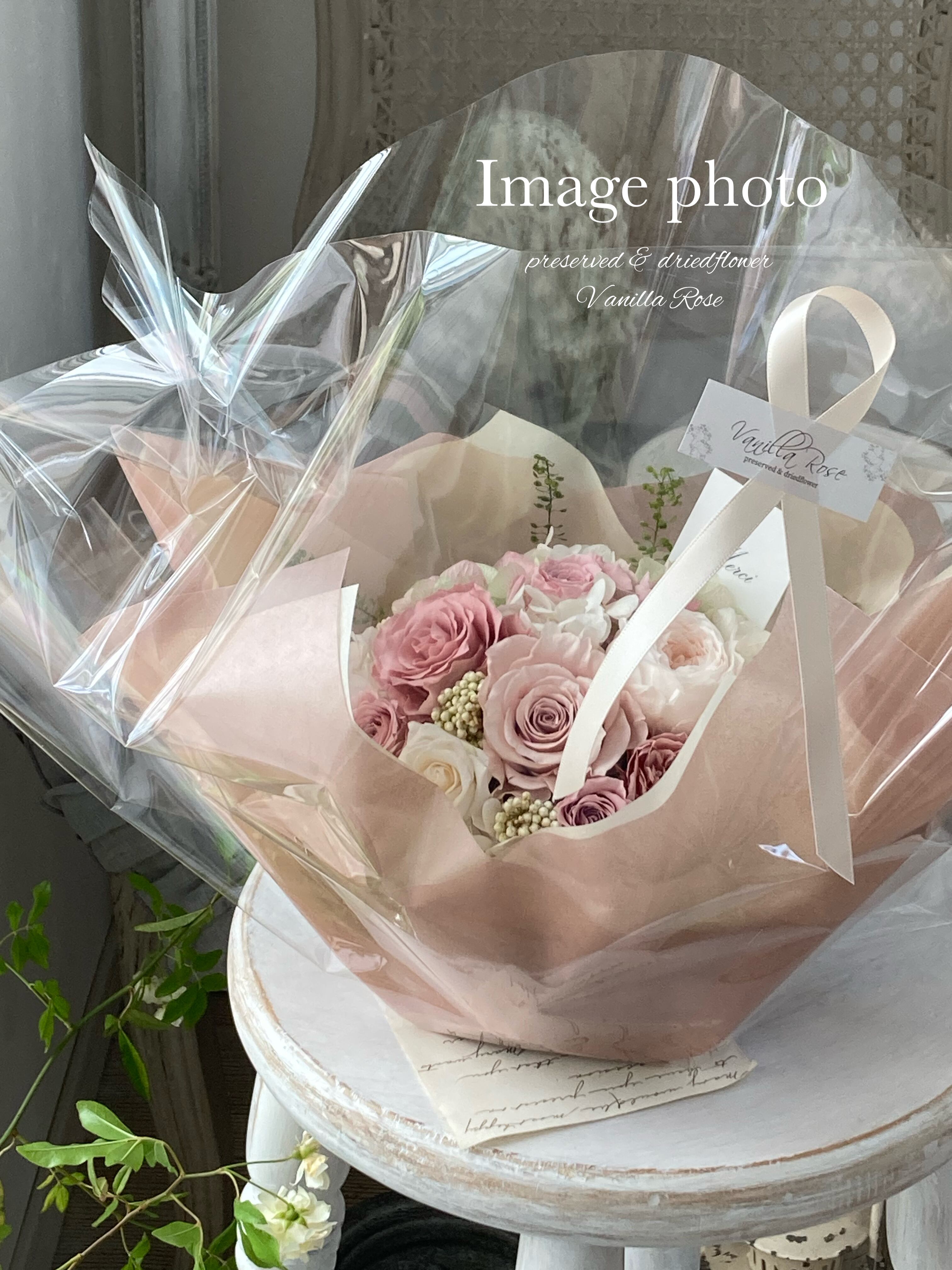 そのため、花材の配置や表情には多少の個体差がございますが、写真の雰囲気を大切にしながら心を込めてお作りいたします。
