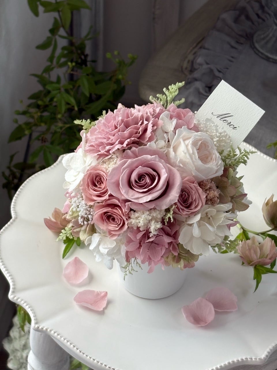 ●バラ1輪、オールドローズ(小)1輪、ミニバラ3輪、紫陽花3種類、かすみ草、小花、カスピアほか(プリザーブドフラワー)カーネーション1輪(アーティフィシャルフラワー)