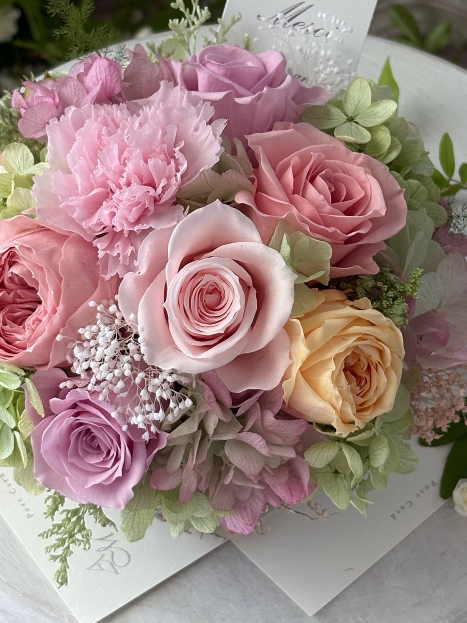 ●カーネーション1輪、スプレーバラ4輪、オールドローズ(小)2輪、紫陽花4種類、小花、かすみ草、カスピア、アスパラガスほか(すべてプリザーブドフラワー)