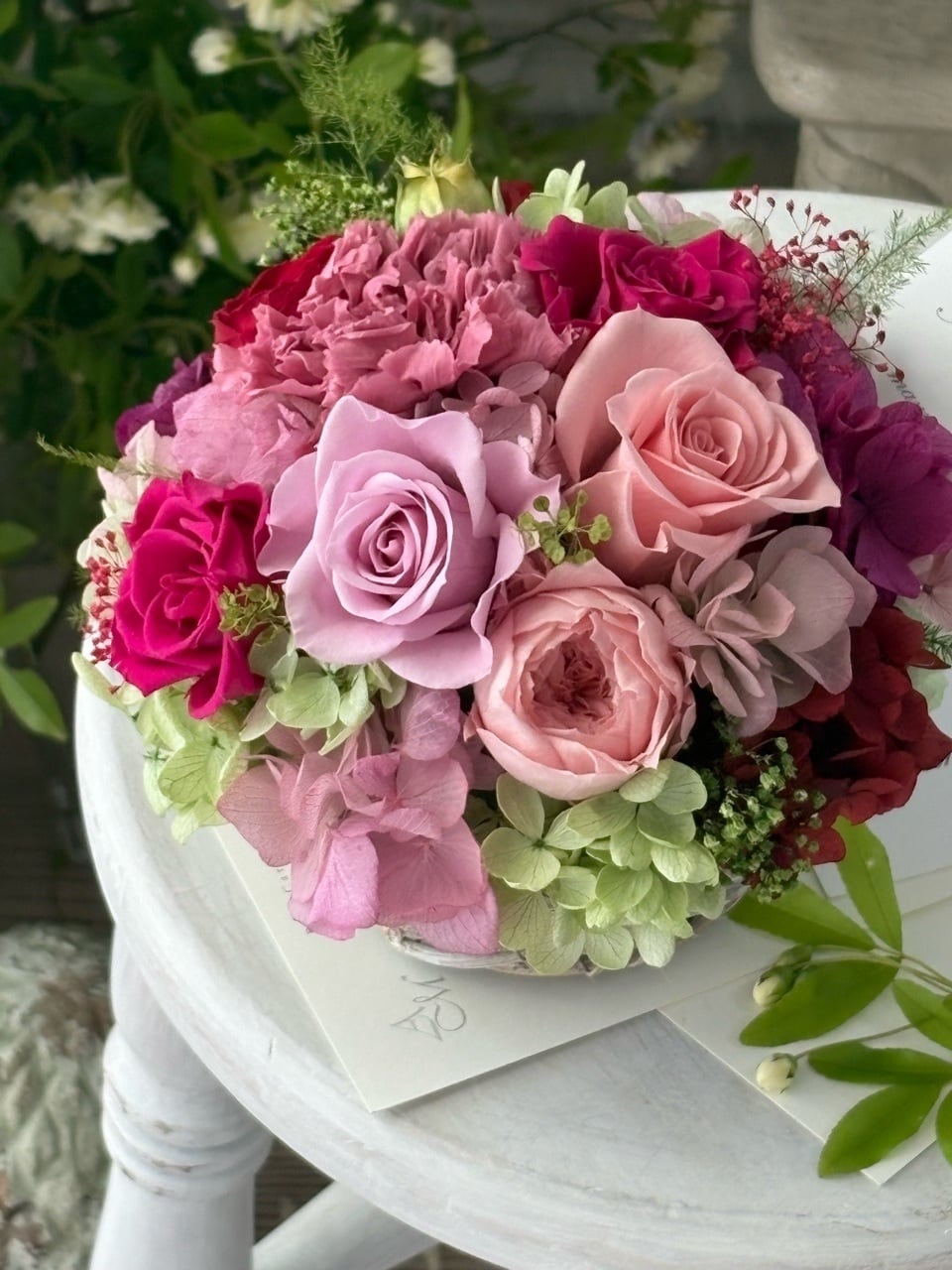 ●カーネーション1輪、スプレーバラ4輪、オールドローズ(小)2輪、紫陽花4種類、小花、かすみ草、カスピア、アスパラガスほか(すべてプリザーブドフラワー)