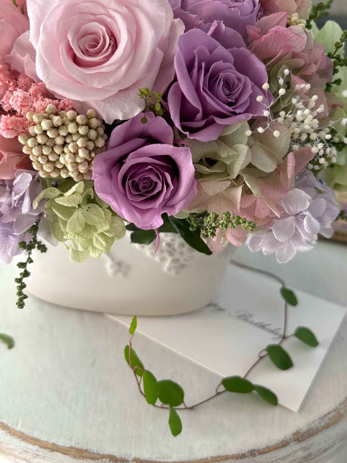 バラと紫陽花のオーバルアレンジメント/ピンクライラック/プリザーブドフラワー/古希祝い/喜寿祝い/傘寿祝い/卒寿祝い/お誕生日のお花/バースデーギフト/ギフト包装あり【お届け日指定可能】【北海道と沖縄県および離島へのお届け不可】