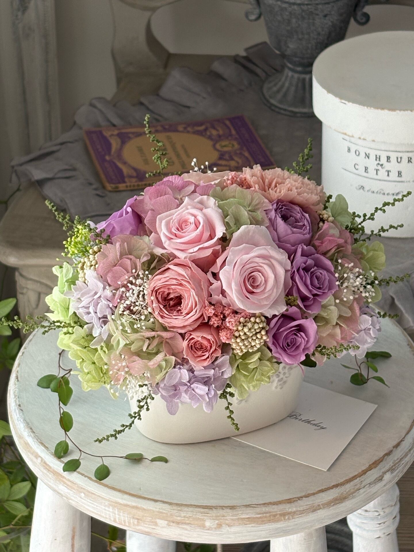 ●バラ2輪、スプレーバラ2輪、オールドローズ(小)2輪、カーネーション1輪、ミニバラ3輪、紫陽花5種類、かすみ草、ライスフラワー、ストーベ、アイビーリーフなど。(すべてプリザーブドフラワー)