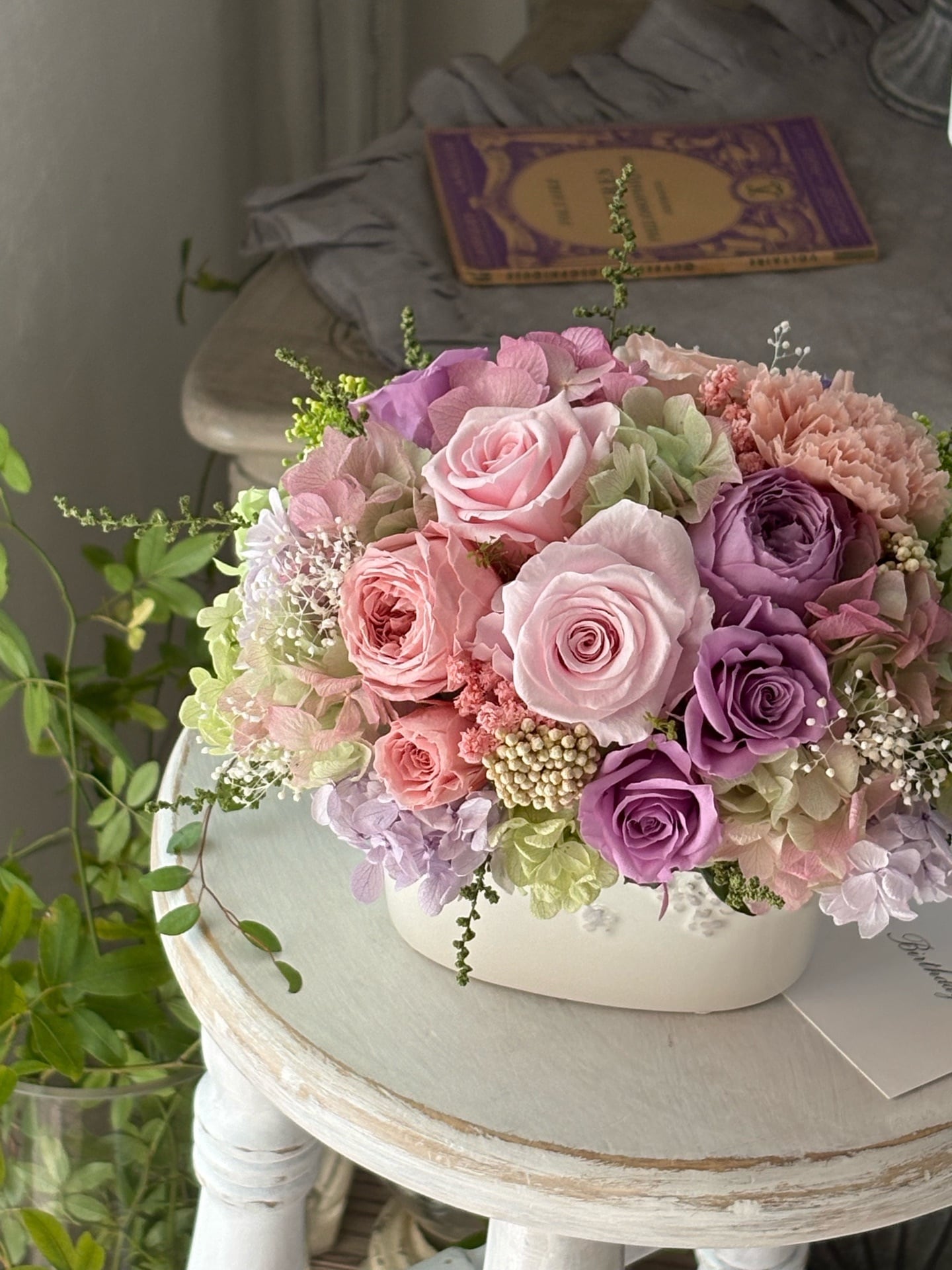 ●バラ2輪、スプレーバラ1輪、オールドローズ(小)2輪、カーネーション1輪、ミニバラ1輪、紫陽花5種類、かすみ草、ライスフラワー、ストーベ、アイビーリーフなど。(すべてプリザーブドフラワー)