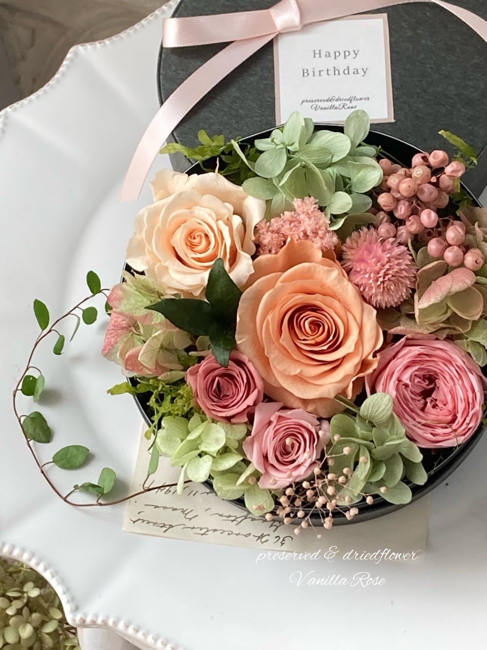 BOXフラワーギフト/オレンジピンク/プリザーブドフラワー/お誕生日のお花/バースデーギフト/誕生日プレゼント【お届け日時指定可能】【北海道と沖縄県・離島へのお届け不可】